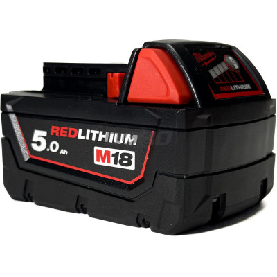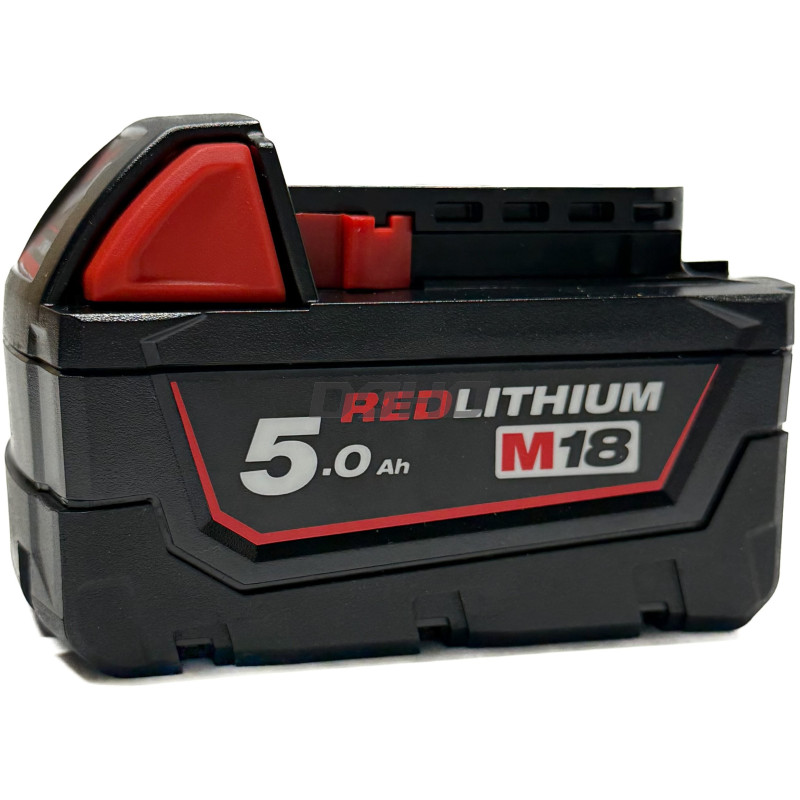 Milwaukee M18 B5 – 18 V galingas akumuliatorius su 5 Ah talpa, užtikrinantis ilgą veikimo laiką ir patikimumą profesionaliuose projektuose.