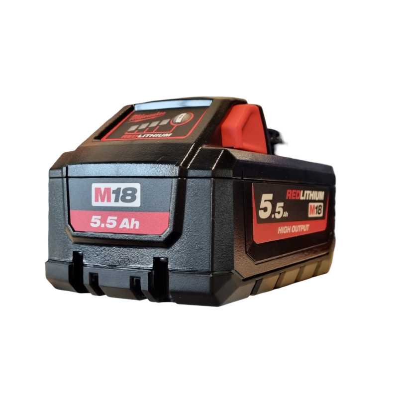 Milwaukee M18 HB5.5 – 18 V akumuliatorius su 5,5 Ah talpa ir HIGH OUTPUT™ technologija, skirtas užtikrinti maksimalų našumą ir ilgą veikimo laiką net sudėtingiausiuose projektuose.