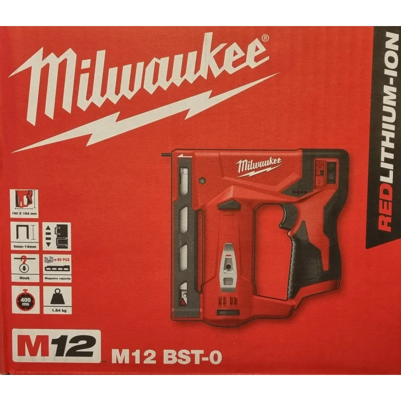 Milwaukee M12 BST-0 akumuliatorinis kabamasis įrankis per vieną įkrovimą su 2,0 Ah baterija įkalą iki 2000 kabių. Tinka T11, T50 ir T140 kabėms (6–14 mm). Ready to Fire technologija ir bump/sequential režimai leidžia greitai ir tiksliai dirbti, sumažinant nuovargį. Apsauga nuo tuščio šūvio, kompaktiškas dizainas – puikiai tinka apmušalams, izoliacijai ar apdailai. Suderinamas su visomis M12™ baterijomis.