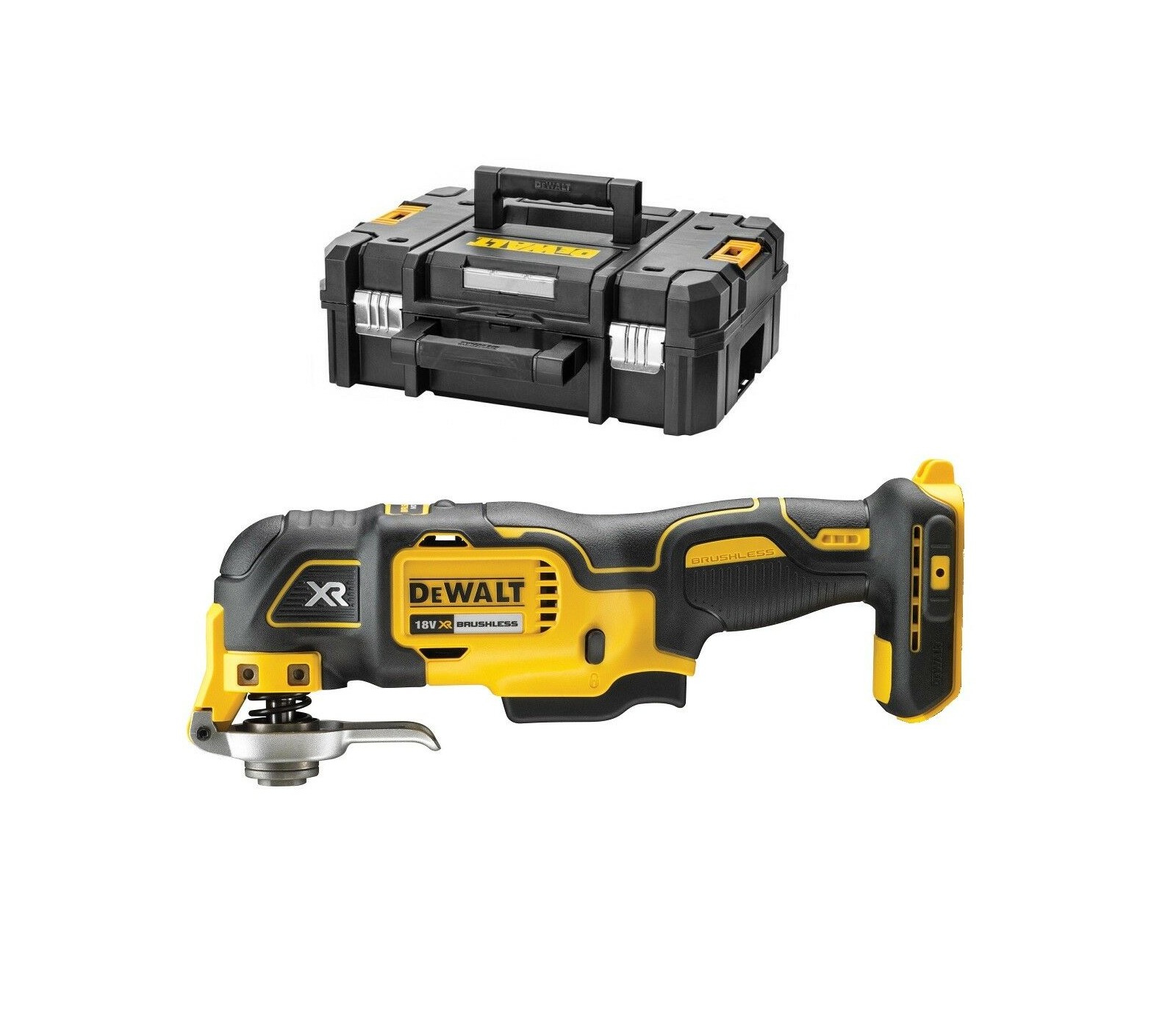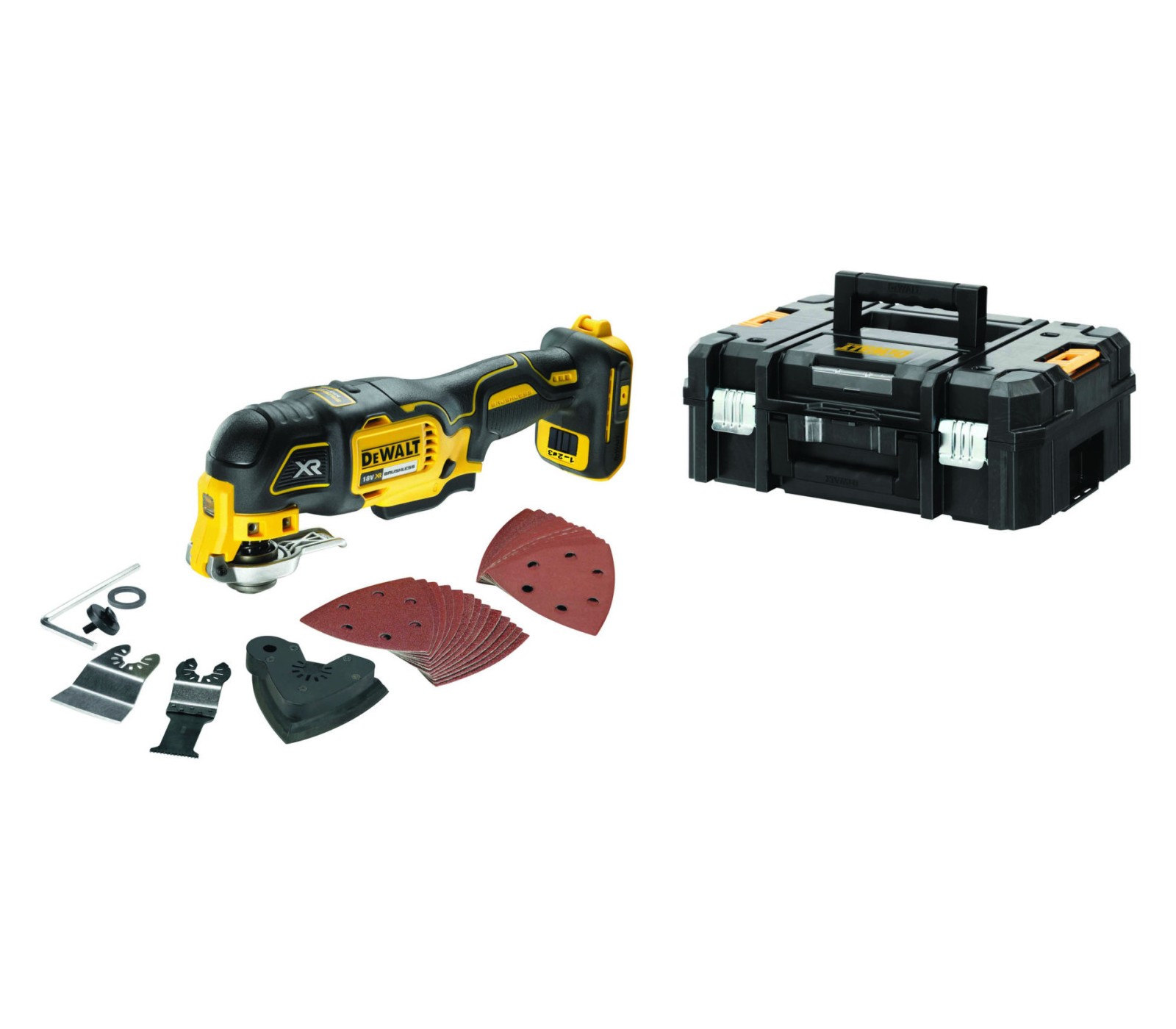 Dewalt DCS356NT 18V daugiafunkcinis įrankis su lagaminu ir priedais yra universalus ir ergonomiškas sprendimas įvairiems darbams.