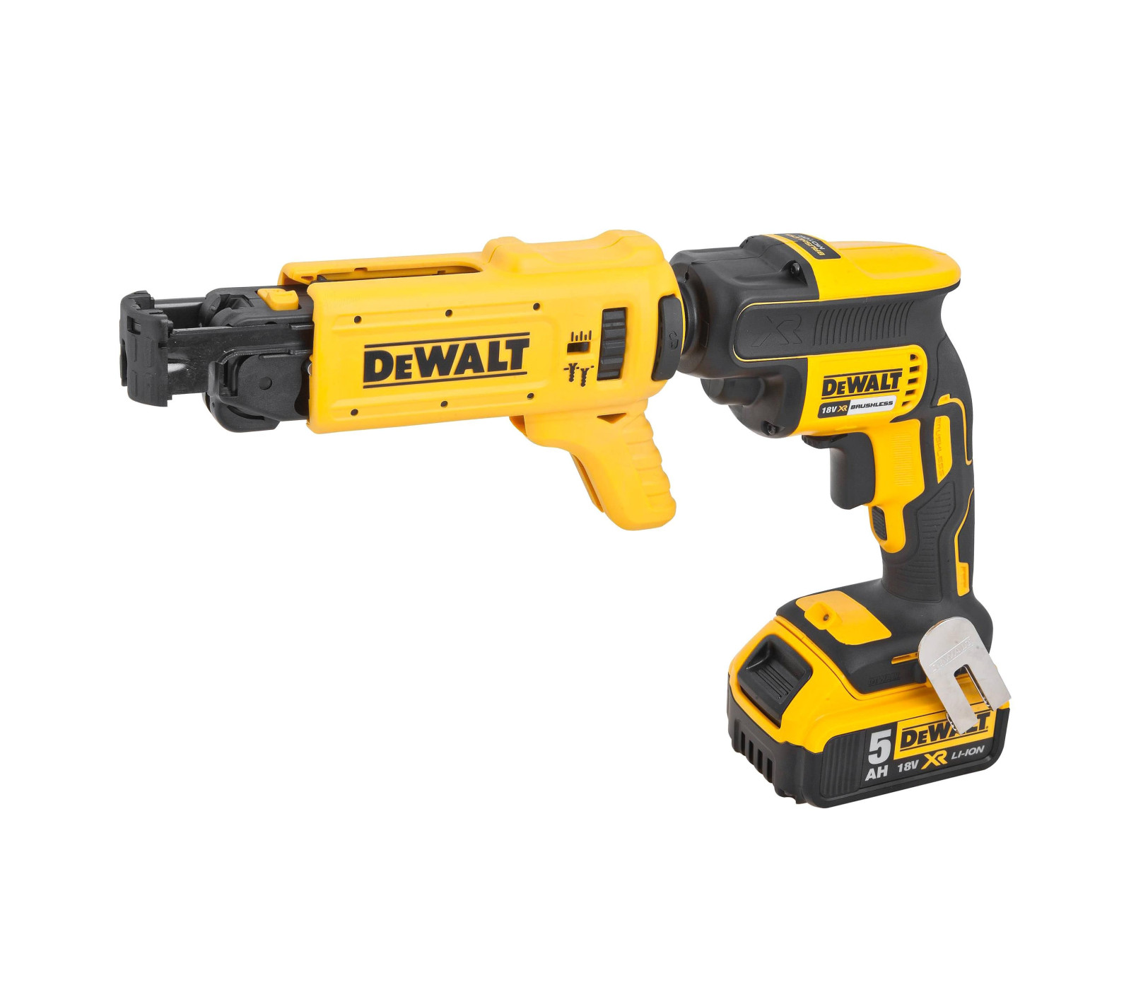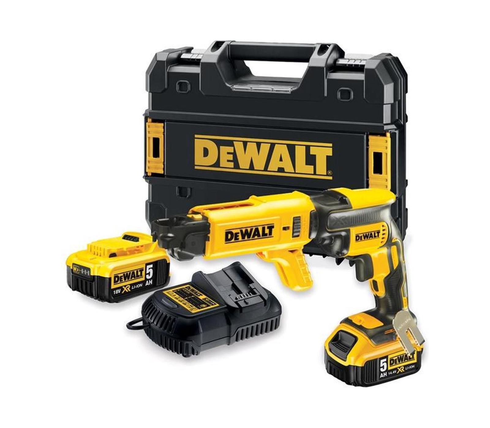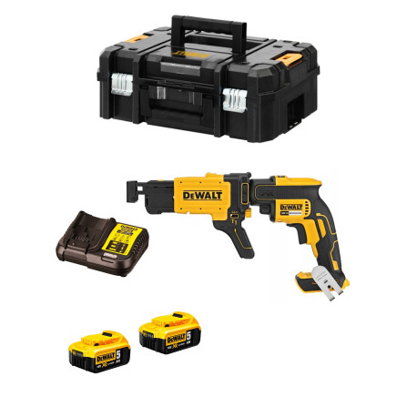 Dewalt DCF620P2K – 18 V akumuliatorinis juostinis suktuvas, skirtas efektyviam gipskartonio tvirtinimui. Komplekte yra 2 x 5 Ah akumuliatoriai, įkroviklis ir lagaminas.