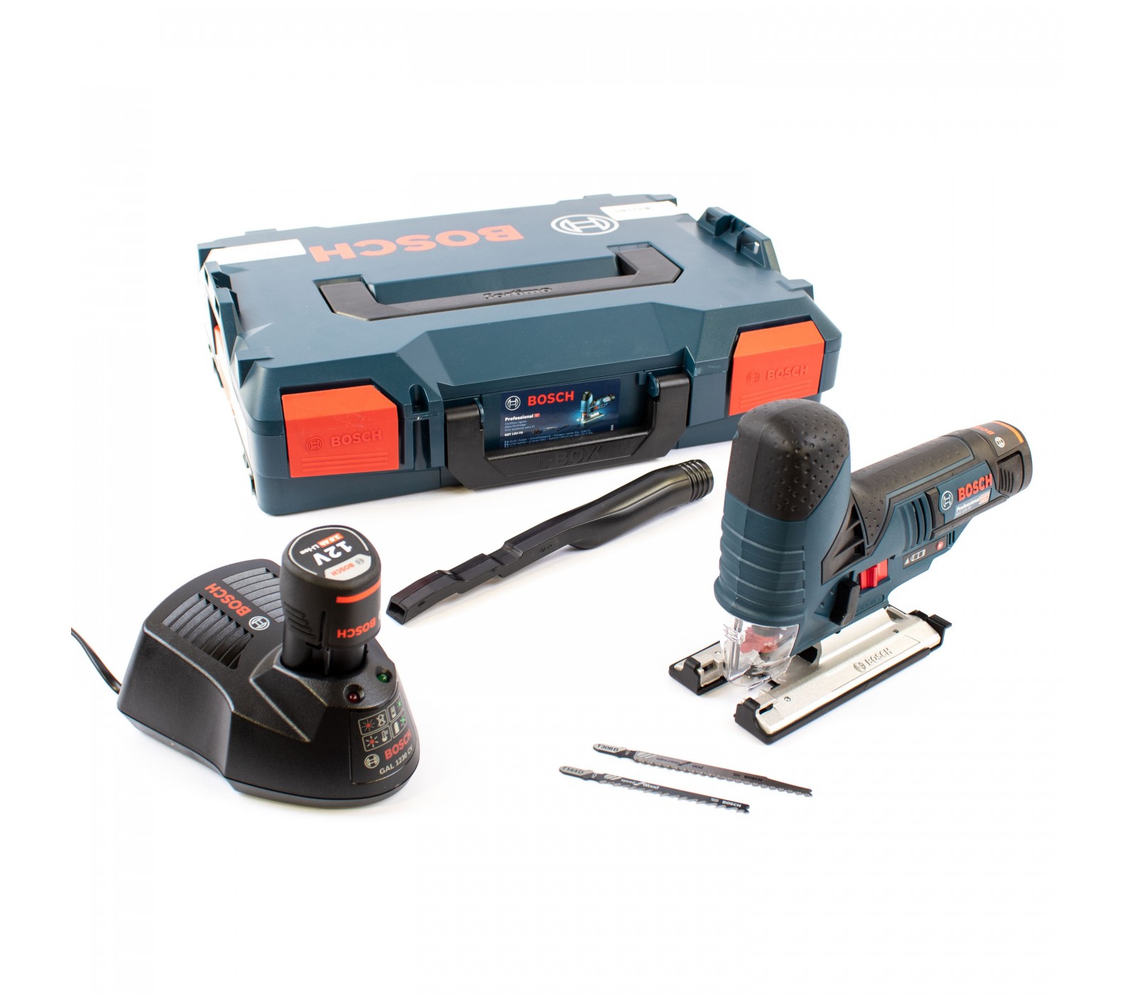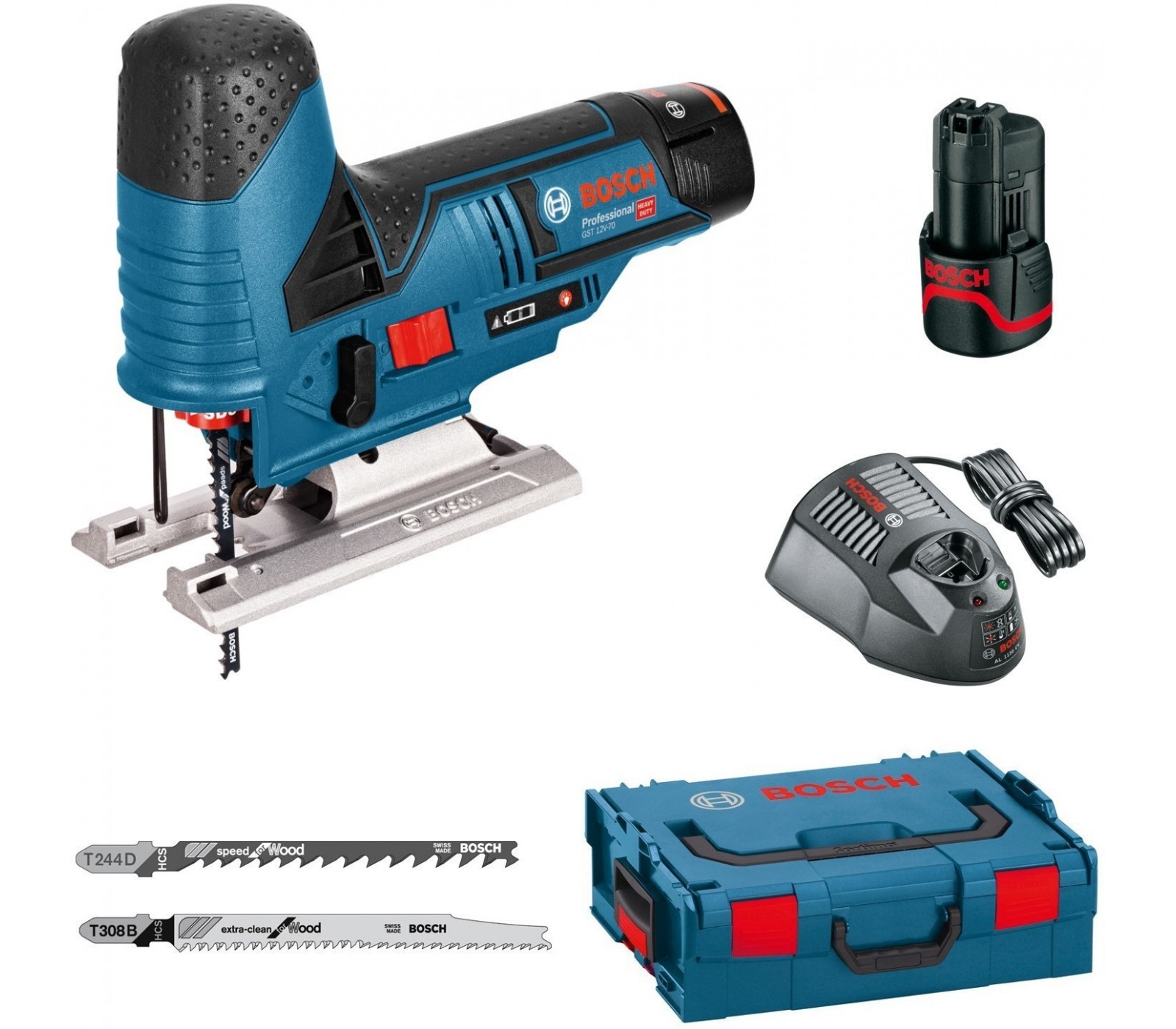 Akumuliatorinio siaurapjūklio Bosch GST 12V-70 rinkinys, 12 V, 2 x 3 Ah, įkroviklis, lagaminas + 2 pjūkleliai