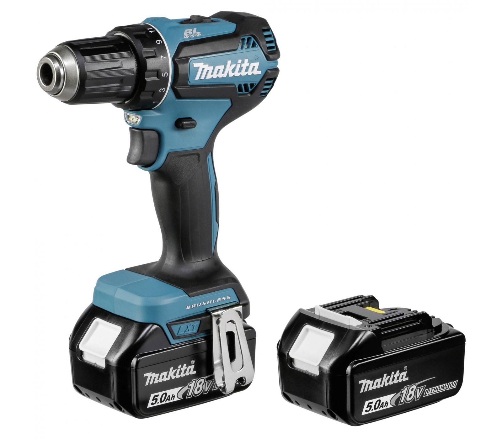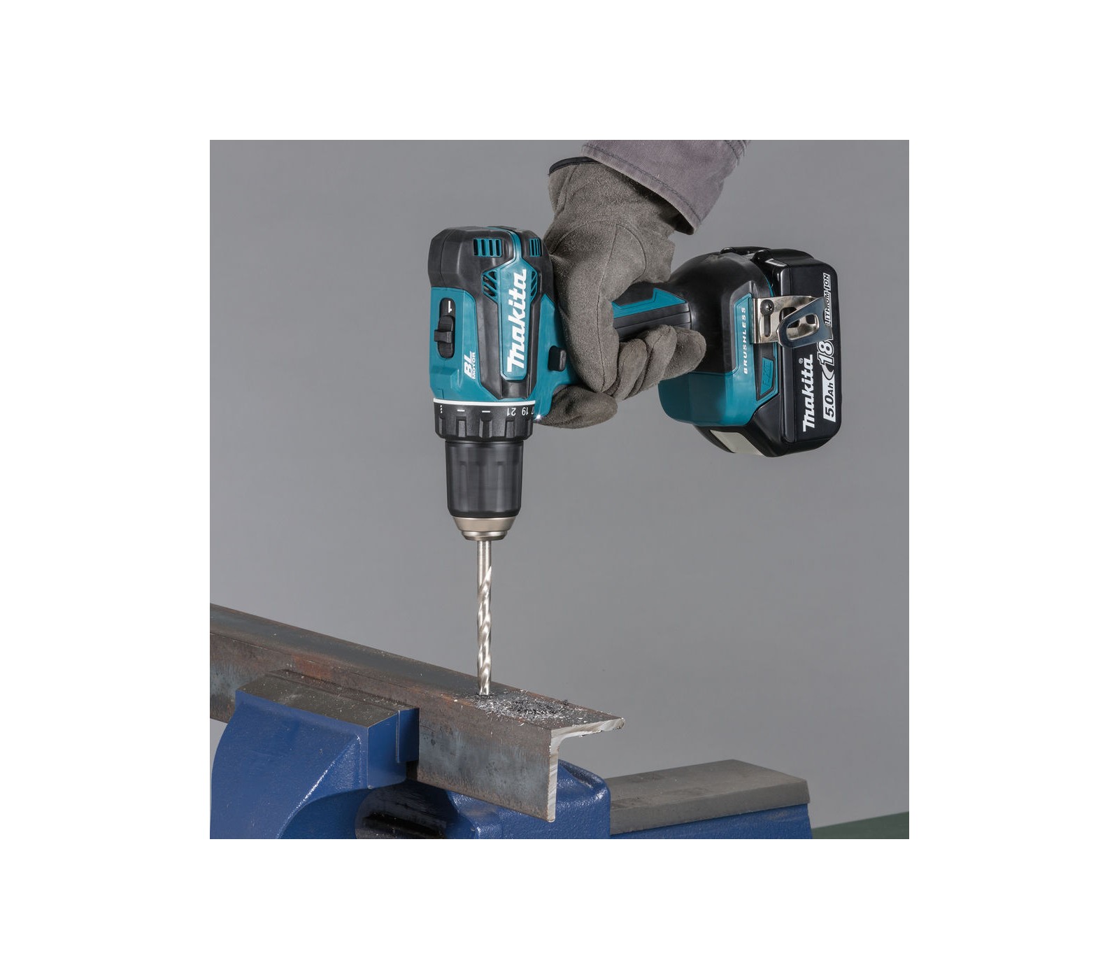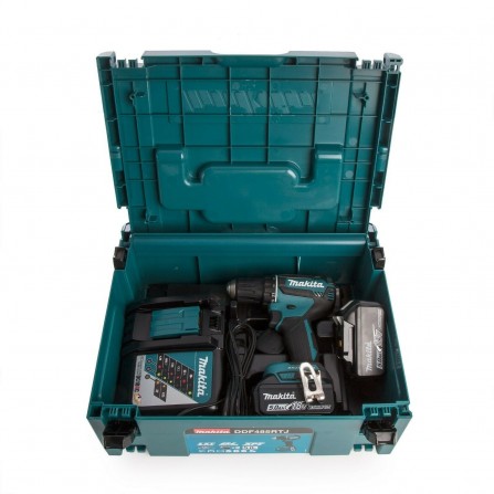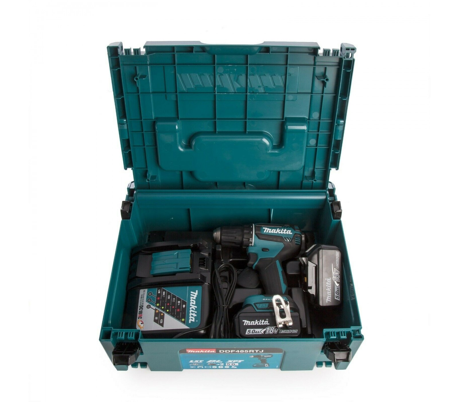 Makita DDF485RTJ rinkinys su 18 V gręžtuvu, 2 x 5 Ah akumuliatoriais, įkrovikliu ir lagaminu yra idealus pasirinkimas ilgiems ir intensyviems darbams.