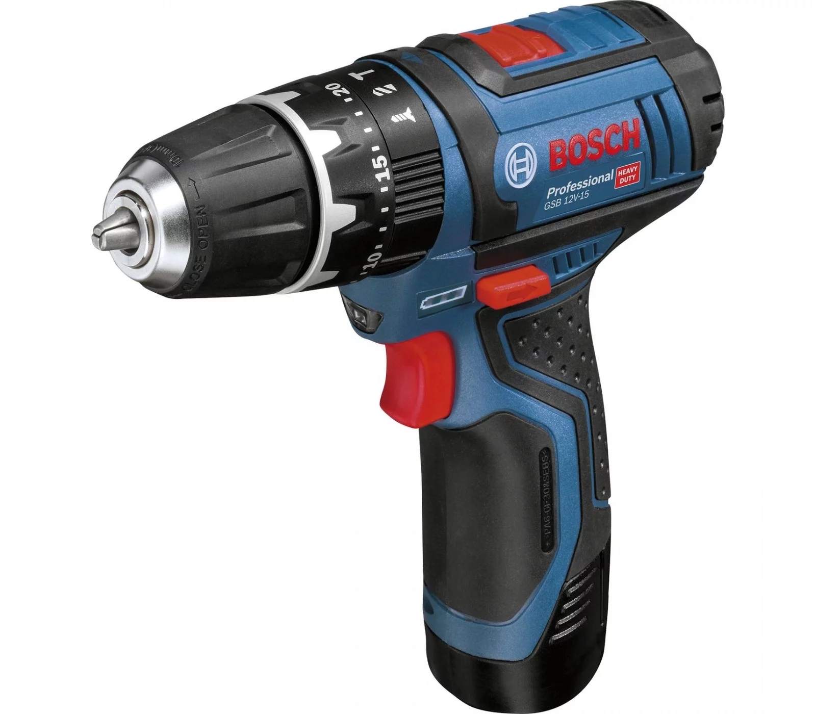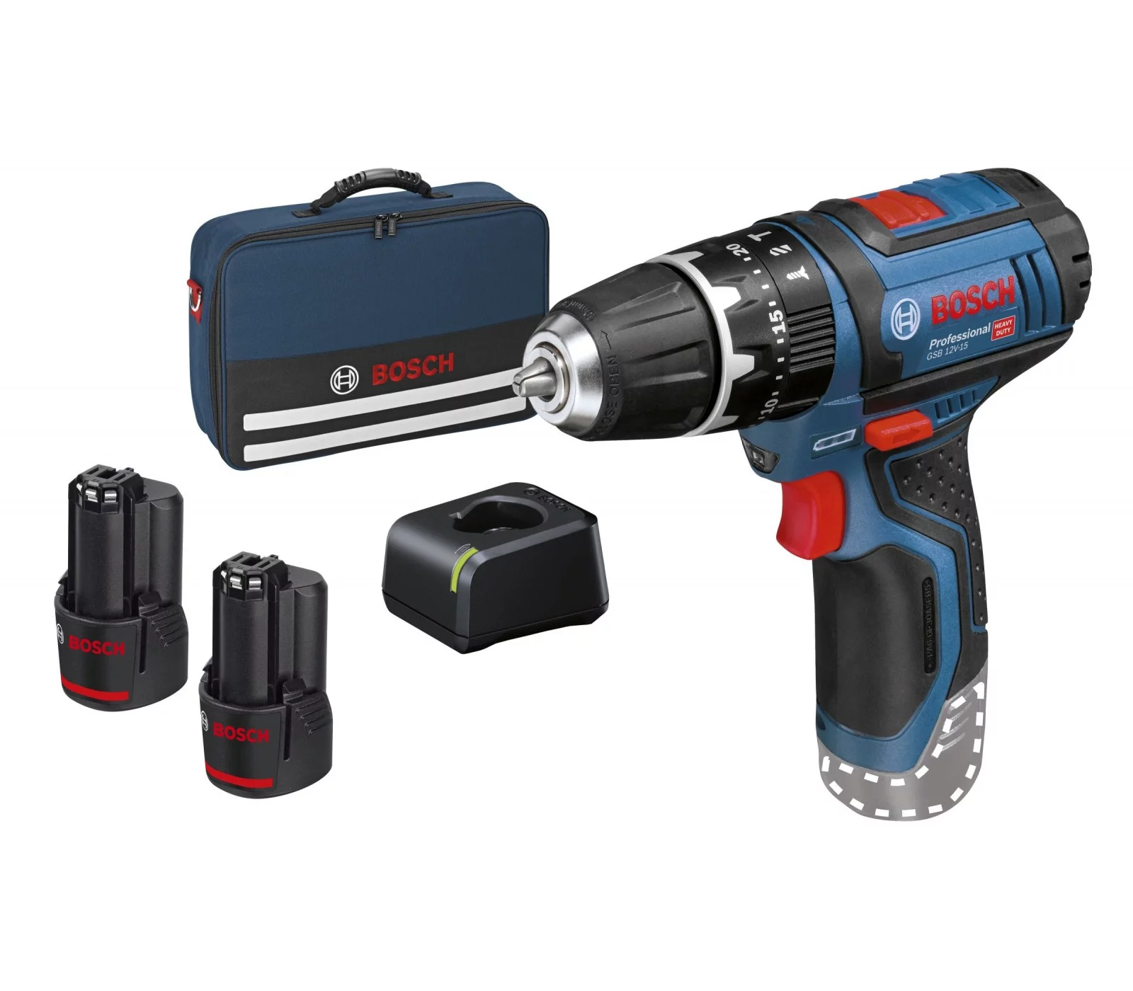 Akumuliatorinio smūginio suktuvo-gręžtuvo Bosch GSB 12V-15 rinkinys, 12 V, 2 x 2 Ah, įkroviklis + krepšys
