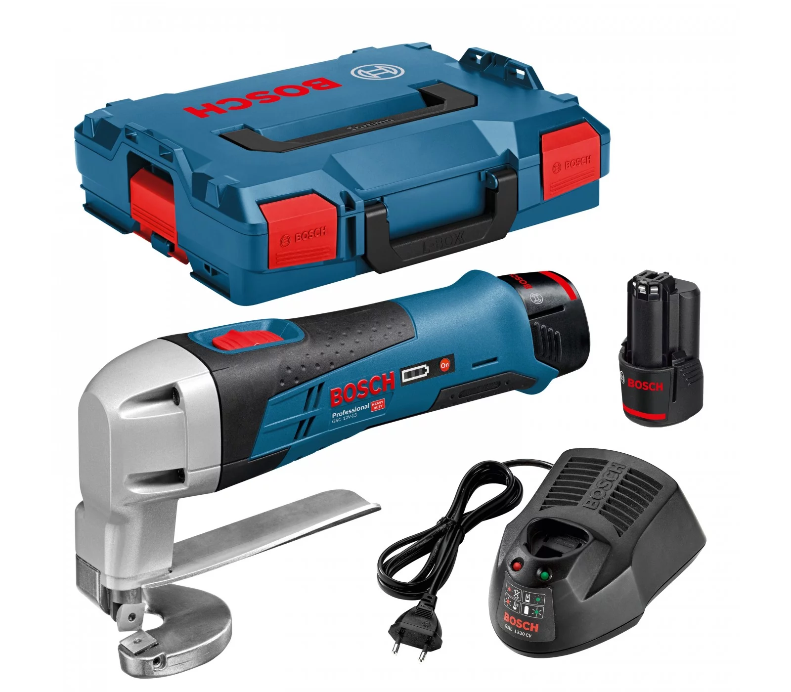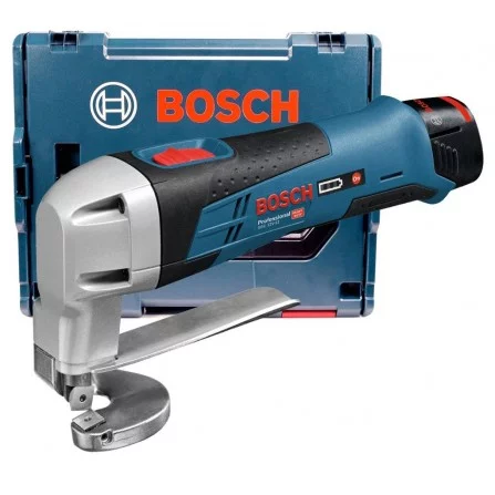 Akumuliatorinių skardos žirklių Bosch GSC 12 V -13 rinkinys, 2 x 2,0 Ah, įkroviklis + lagaminas L-Boxx 102