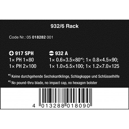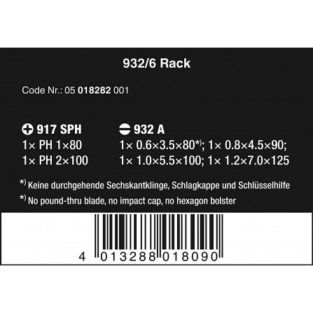 917 SPH05017005001 1 x PH 1 x 80 mm 05017010001 1 x PH 2 x 100 mm 932 A05018260001 1 x 0,6 x 3,5 x 80 mm 05018262001 1 x 0,8 x 4,5 x 90 mm 05018264001 1 x 1 x 5,5 x 100 mm 05018266001 1 x 1,2 x 7 x 125 mm