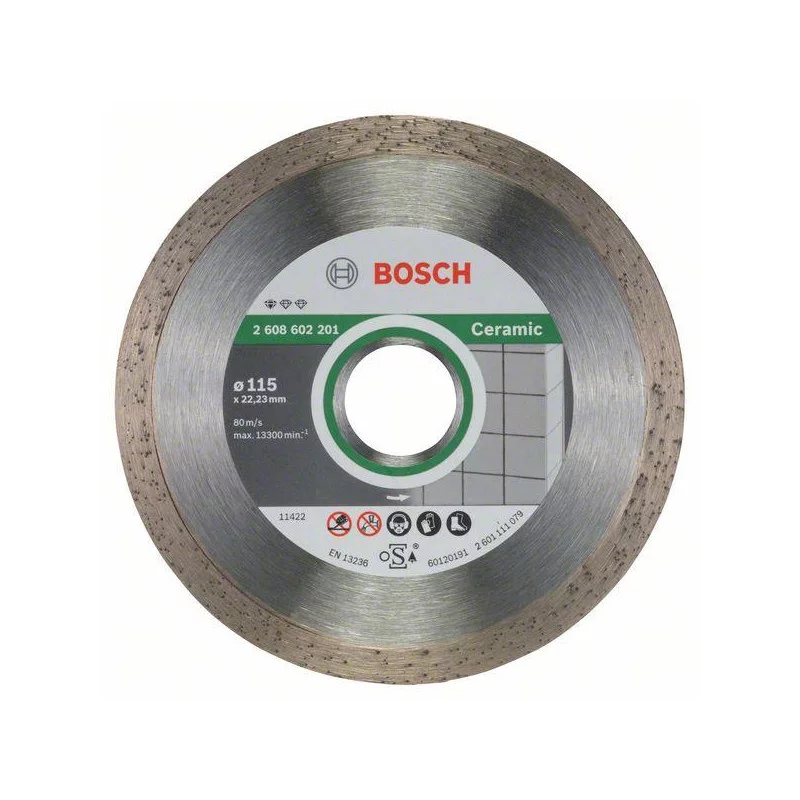 Prekės ženklas- Bosch. Artikulas- 2608602201. Skersmuo- 115 mm. Vidinės skylės skersmuo- 22.23 mm. Storis- 1.6 mm. Svoris- 0.140 kg. Deimantinio disko tipas- Ištisinis. Apdirbama medžiaga- Plytelės, Keramika, Marmuras. Tinka pjovimui- Sausam. Vienetai pakuotėje- 1. Segmento aukštis- 7 mm. Maksimalus sūkių dažnis per minutę- 13300 rpm. Pjovimo greitis- 80 m/s. Garantija- 24 mėn. Tinka įrankiams- Kampiniams šlifuokliams. Papildoma informacija- Svoris: 0,140 kg. Detalių medžiaga: plytelės, keramika, marmuras. Segmento aukštis: 7 mm. Maksimalus greitis per minutę: 13300 aps./min. Pjovimo greitis: 80 m/s.