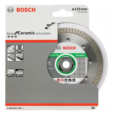 Deimantinis pjovimo diskas keramikai Bosch Extra-Clean Turbo yra aukštos kokybės įrankis, skirtas efektyviam ir švariam keramikos pjovimui. Jo dydis 115 x 22,23 x 1,4 mm leidžia naudoti jį įvairiems projektams, o inovatyvi technologija užtikrina ilgaamžiškumą ir puikius pjovimo rezultatus.