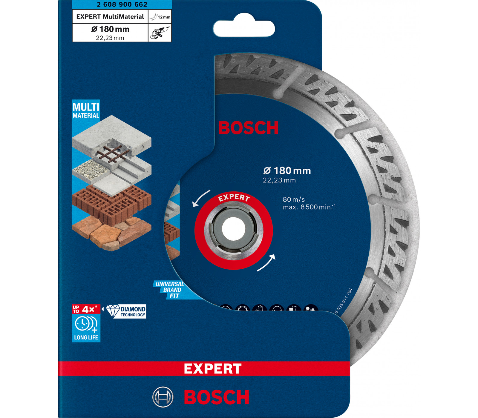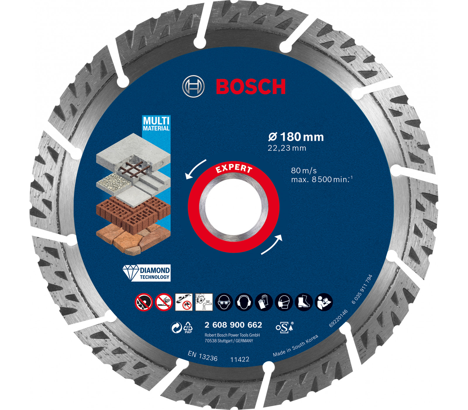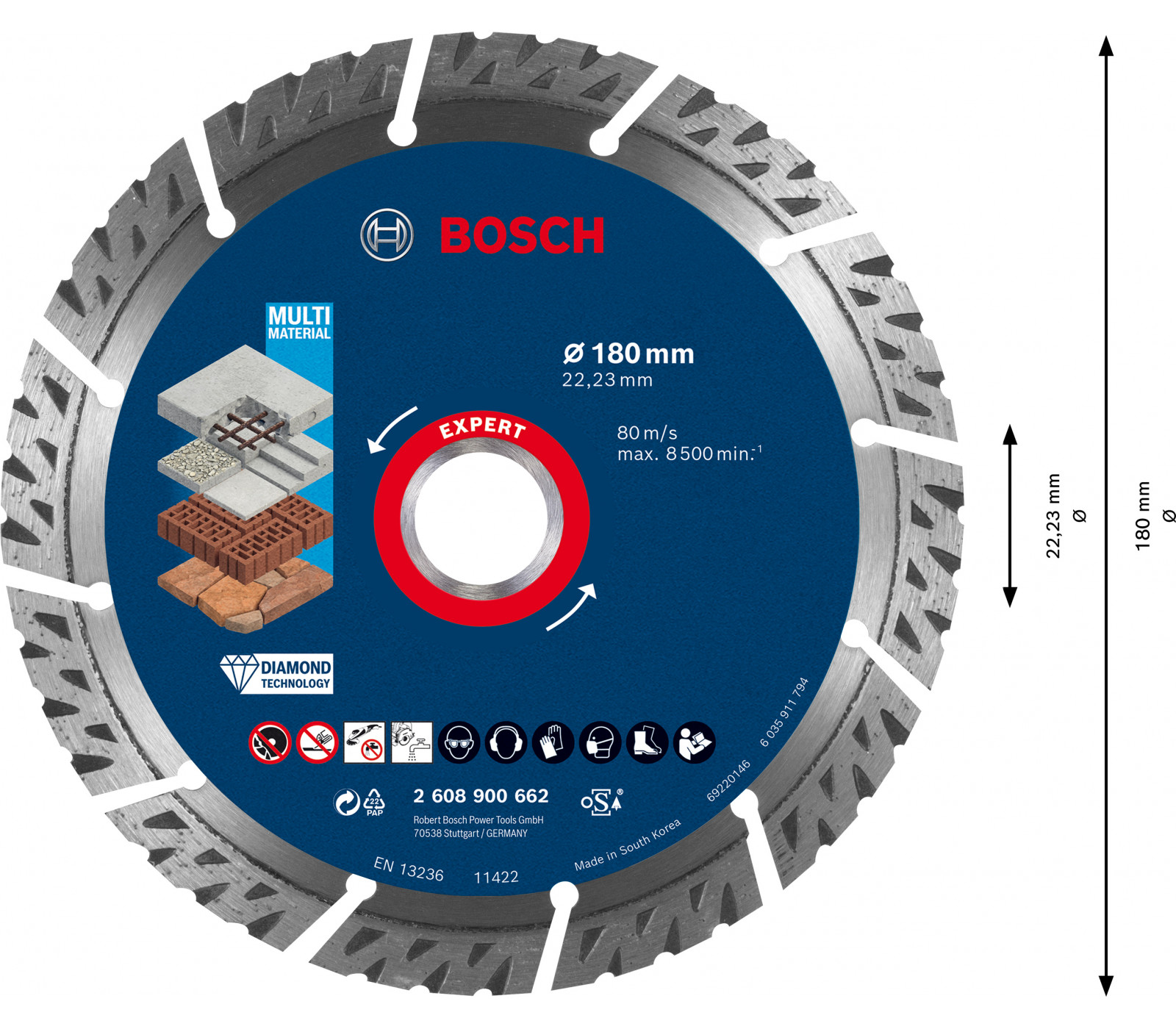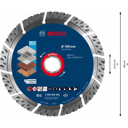 Prekės ženklas- Bosch. Artikulas- 2608615065 . Skersmuo- 230 mm. Vidinės skylės skersmuo- 22.23 mm. Storis- 2.3 mm. Deimantinio disko tipas- Turbo. Apdirbama medžiaga- Keramika. Tinka pjovimui- Sausam. Vienetai pakuotėje- 1. Maksimalus sūkių dažnis per minutę- 6650 rpm. Pjovimo greitis- 80 m/s. Garantija- 24 mėn. Tinka įrankiams- Kampiniams šlifuokliams. Papildoma informacija- Didžiausias greitis per minutę: 12250 aps/min. Pjaustomo paviršiaus tipas: sausas.