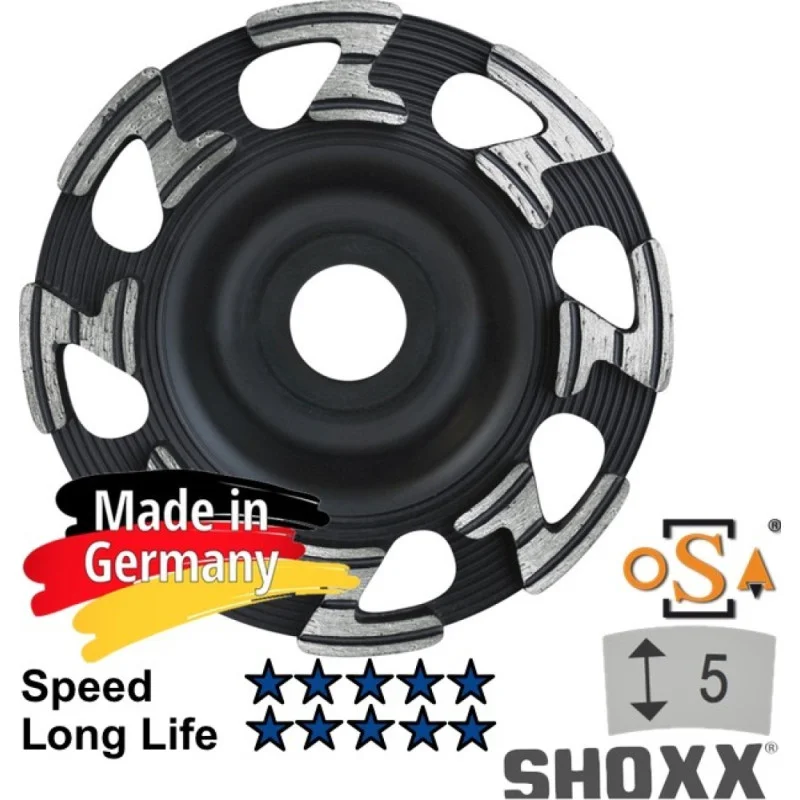 Privalumai: • Idealiai išbalansuota • Efektyvi • Greita • Segmentai tvirtinti indukciniu būdu • Jokios vibracijos • Našiausi SHOXX segmentai • Optimalus dulkių pašalinimas • Pagaminta Vokietijoje Papildoma informacija: • 19 mm skersmens skylė tvirtinimui. Įrankis naudojamas: • Betono šlifavimui • Kietesnių medžiagų šlifavimui