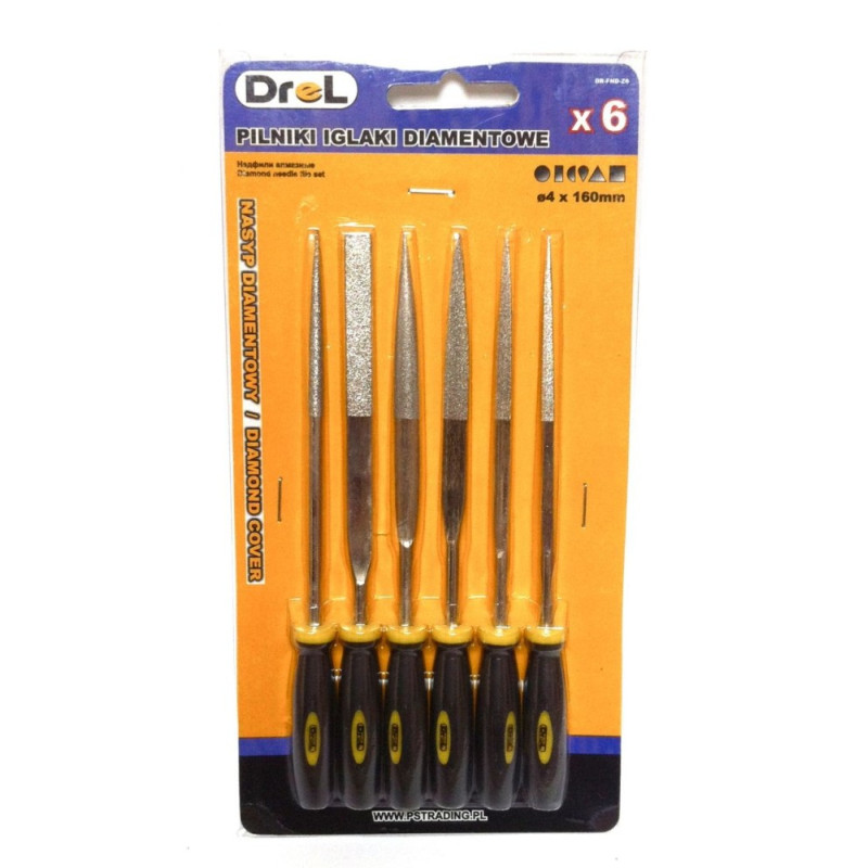• Deimantinių dildžių komplektas. • 160 mm ilgio. • 6 vienetai komplekte: apvali, plokščia, ovali, trikampė, keturkampė, rombo formos.