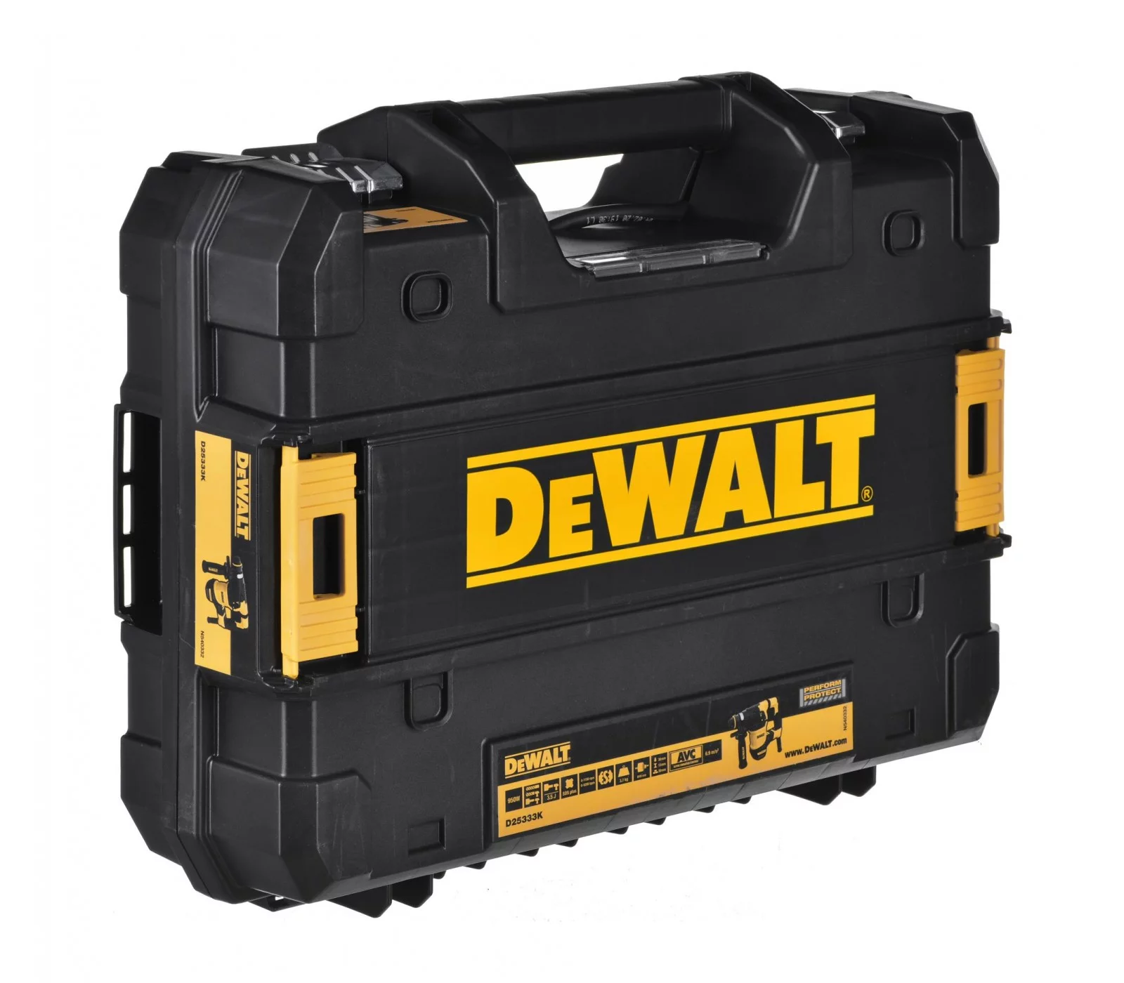 „Dewalt elektrinis perforatorius D25333K“ yra galingas ir patikimas įrankis, skirtas profesionaliam naudojimui. Jo 950 W variklis ir 3,5 J smūgio energija užtikrina efektyvų darbą tiek gręžiant, tiek perforuojant įvairias medžiagas. Dėl kompaktiško dizaino ir lagamino, šis perforatorius yra patogus nešiotis ir saugoti.