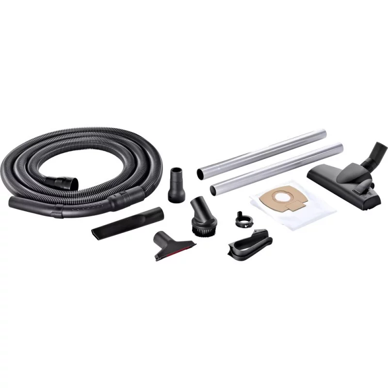 Siurbimo žarna, filtras, 2 x prailginimo vamzdžiai, grindų antgalis, apvalus šepetys, plyšių antgalis, audinių antgalis, siurbimo vamzdžio laikiklis, adapteris Ø27-32 mm, vienkartinis dulkių maišas
