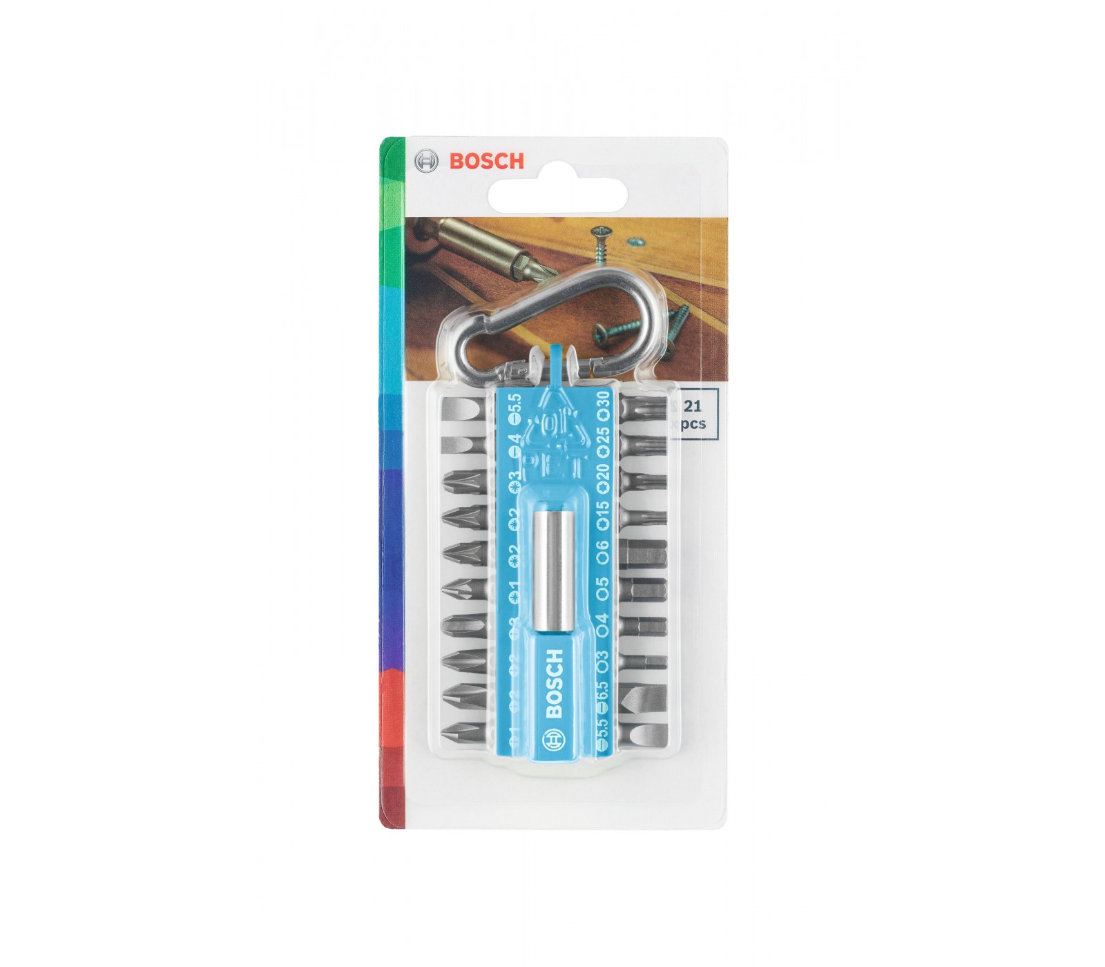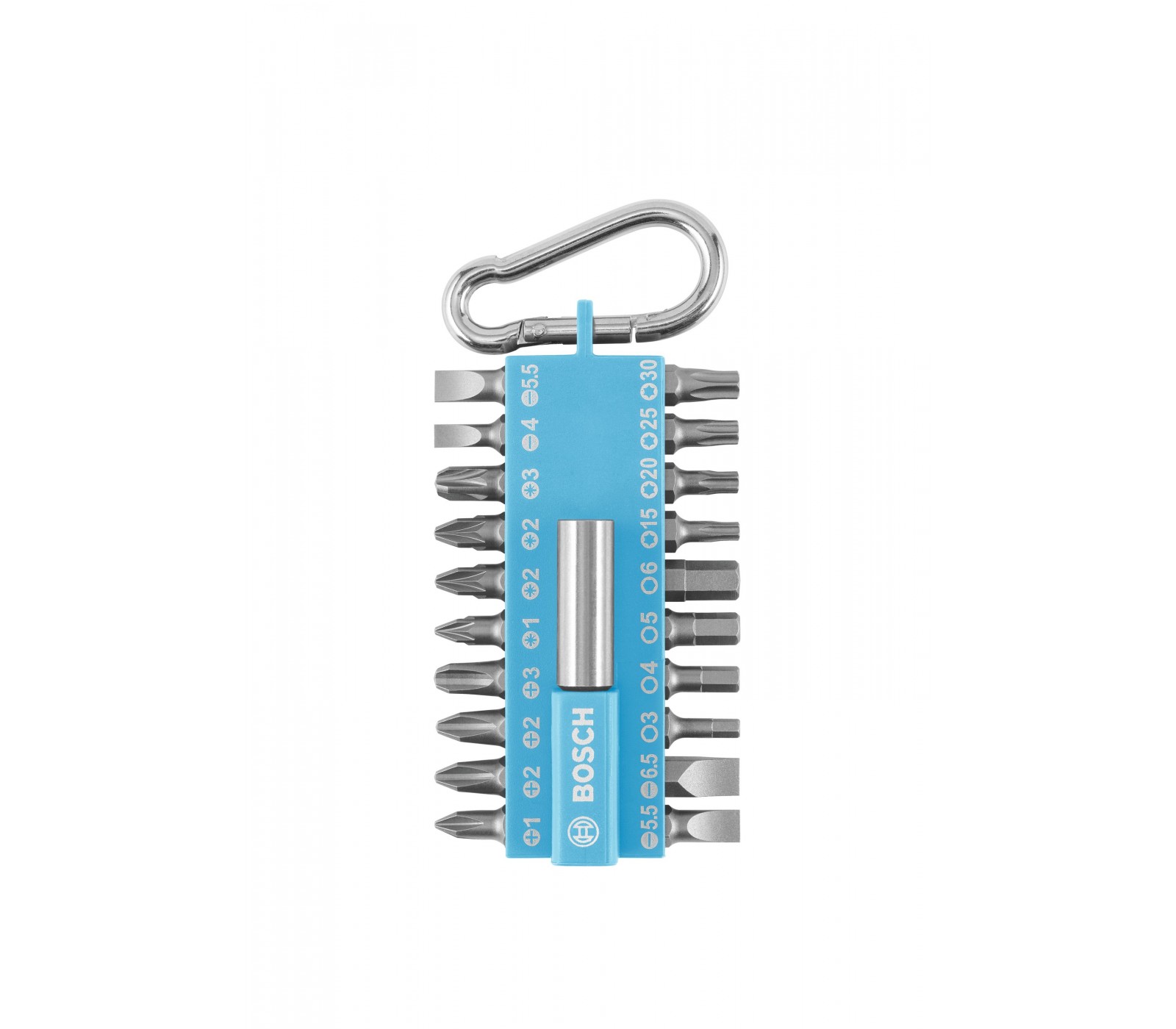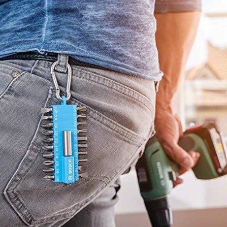 PH 1 / 2 x PH 2 / PH 3, PZ 1 / 2 x PZ 2 / PZ 3, SL 4 / 2 x SL 5,5 / SL 6,5, T 15 / T 20 / T 25 / T 30, vidinis šešiakampis: 3mm / 4mm / 5mm / 6mm, 1 x magnetinis laikiklis