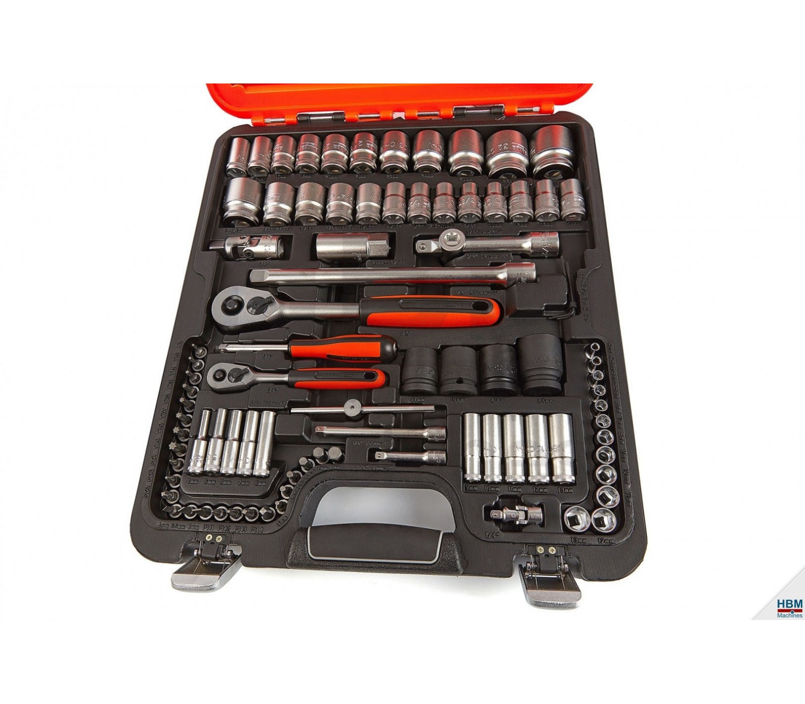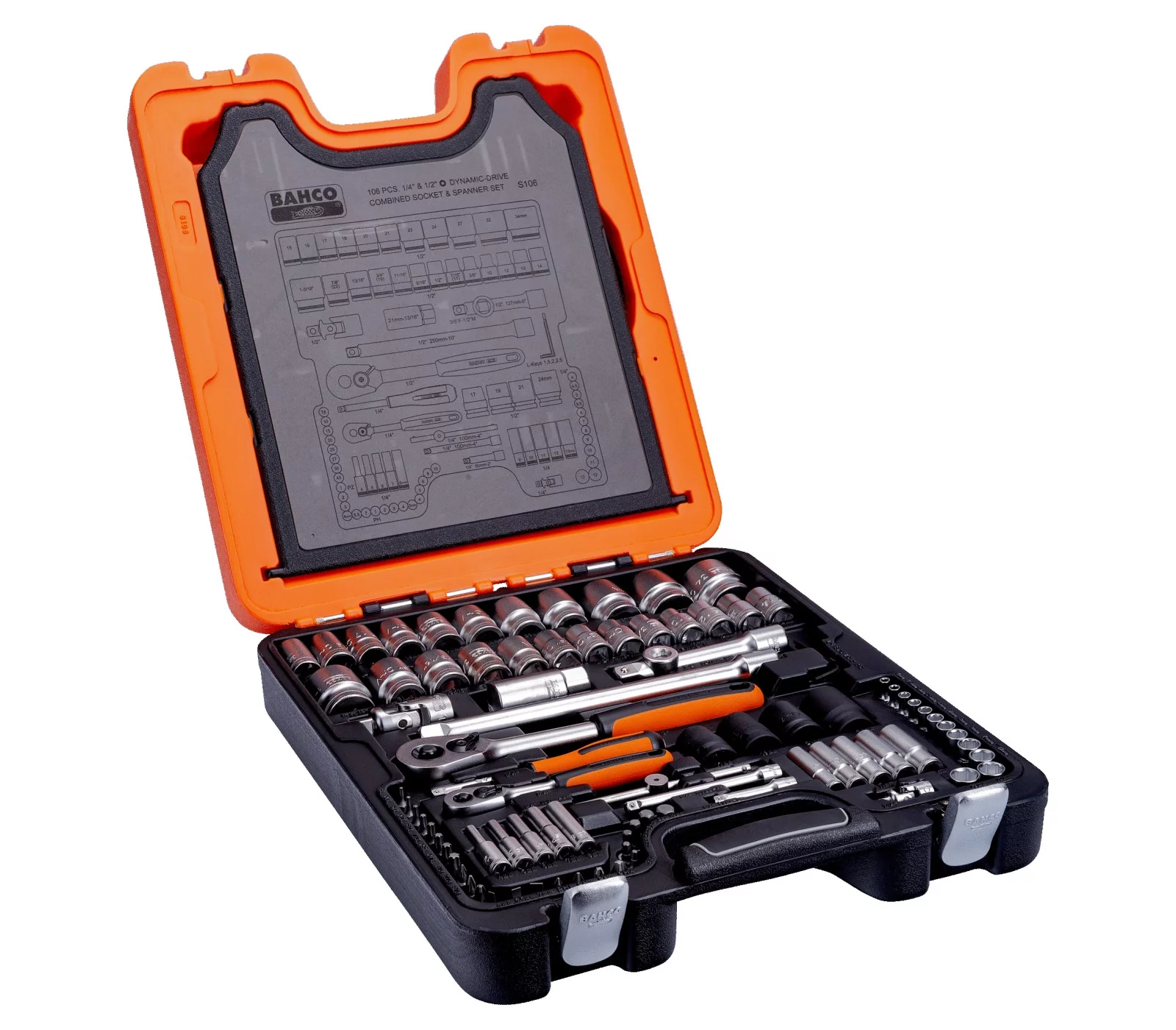 Galvučių, raktų su terkšlėmis ir priedų rinkinys Bahco (S106), 1/2", 1,4", 106 vnt