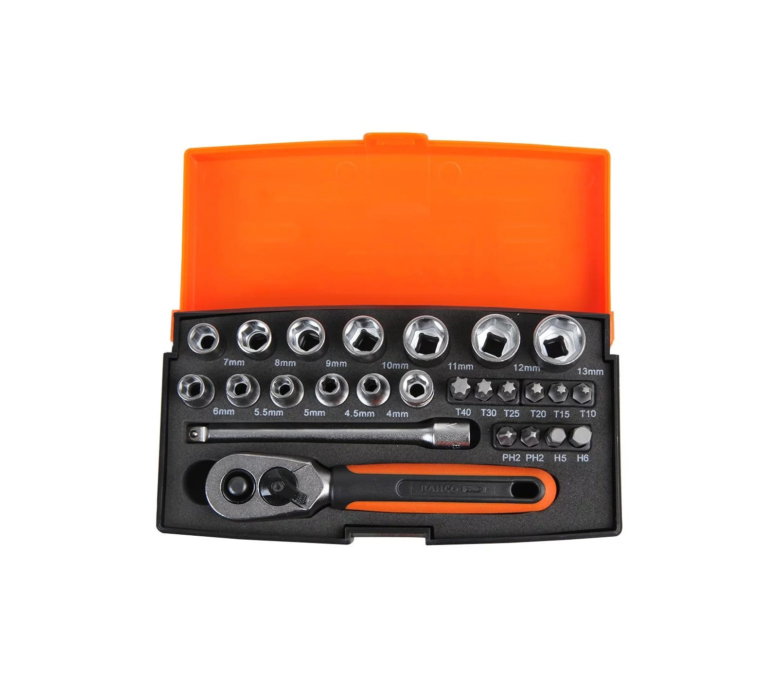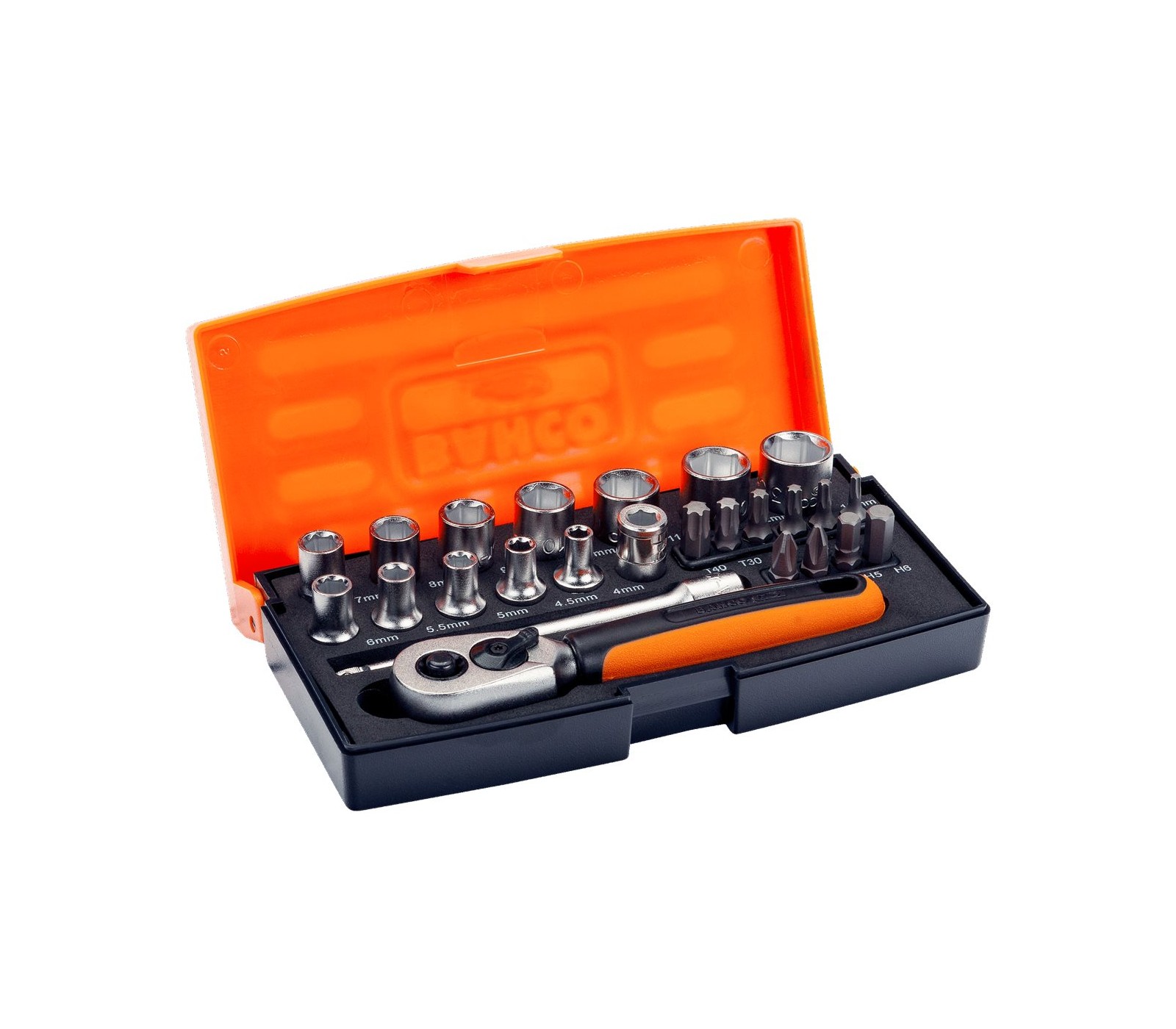 "12 x 1/4" šešiakampės galvutės 4-13 mm1 x 1/4" terkšlė, 60 dantų/6° veikimo kampas, 125 mm2 x 1/4" sukimo galvutės, PH22 x šešiakampiai antgaliai:5,6 mm6 x TORX antgaliai: T10-T401 x 1/4" antgalių laikiklis1 x 1/4" prailginimo jungtis, 100 mm.
