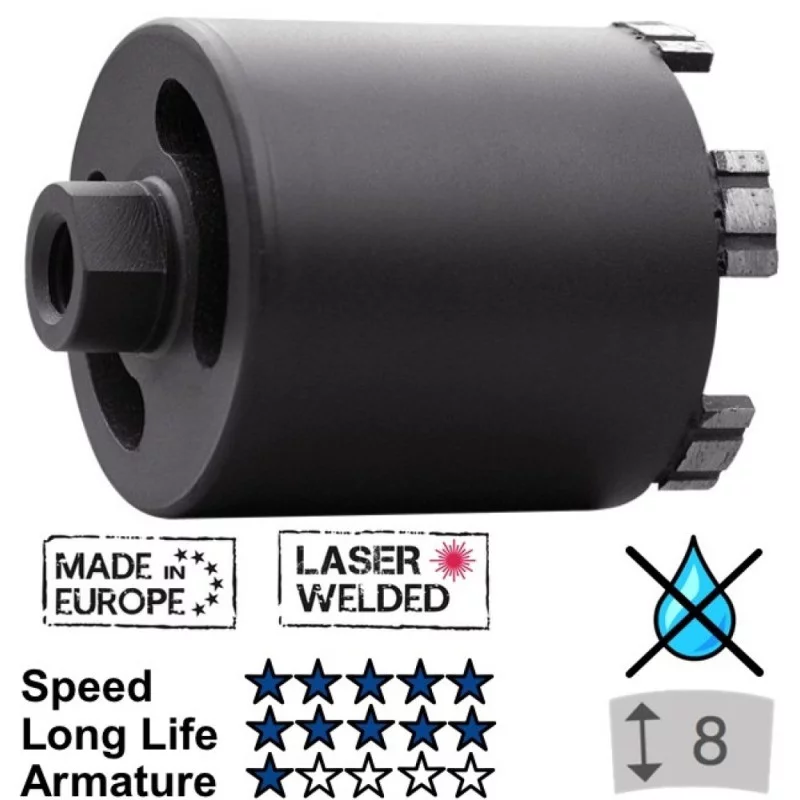 Privalumai: • TURBO segmentai atlaiko aukštesnę temperatūrą - ilgesnis naudojimo laikas. • Lazeriutvirtintas segmentas - tvirtas sukibimas su pagrindu. Naudojimas: • Naudoti su dulkių nusiurbimu. Papildoma informacija: • Gręžimui sausu būdu. • Pagaminta Europoje.