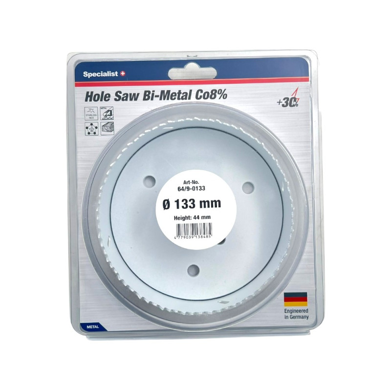 Karūna SPECIALIST+ Bi-Metal 133 mm yra pažangi gręžimo karūna, pagaminta iš Bi-Metal HSS-Co(8%), užtikrinanti ilgaamžiškumą ir greitą gręžimą. Jos gylis yra 40 mm, ir ji puikiai tinka gręžti įvairias medžiagas, įskaitant metalus, medieną ir plastiką.