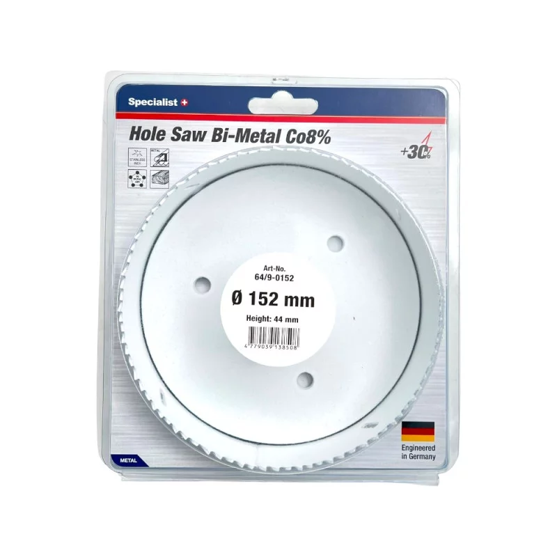 Bi-Metal gręžimo karūnos, pjovimo gylis yra 40 mm, ideliai tinka metalui, plastikui, gipso kartono medžiagoms ir izoliacinėms plokštėms (pvz., gipso kartono plokštėms ir OSB plokštėms). • Puikiai tinka gręžti: juodą metalą, spalvotus metalus, nerūdijantį plieną, minkštą medieną, medieną su vinimis, laminatą, plastiką (PVC, PE, PP, PS, PA), stiklo pluoštu sustiprinta plastikinę plokštę, akrilinį stiklą, izoliacinę plokštę, putplasčio plokštę, gipso kartono plokštę.• Galima gręžti: statybinį plieną, ketų, OSB plokštę, kietmedį, MDF plokštę, terasos medieną, multiplex plokštę, HDF plokštę, parketą.• Suprojektuota ir patobulinta Vokietijoje.