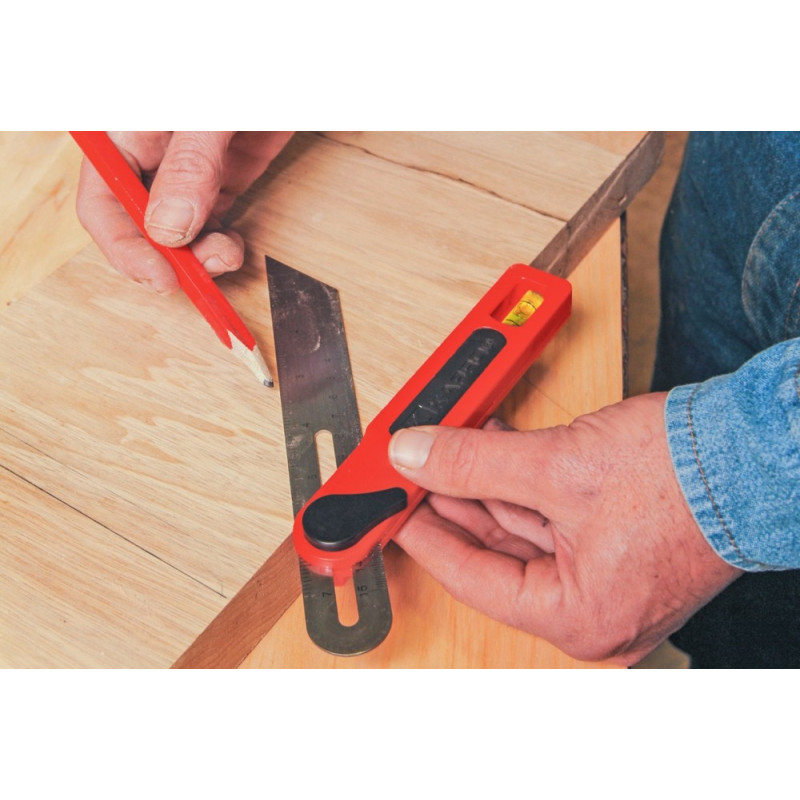 • Tvirta nerūdijančio plieno / plastiko konstrukcija. • Viena akutė. • 15°, 30°, 45°, 60° ir 75° kampai sužymėti ant rankenos. • Matmenų žymėjimas išgraviruotas ant plieno. • Matmenų žymėjimai centimetrais ir coliais. Įrankio panaudojimas: • Statybos darbams. • Dailidės darbams. • Metalo apdirbimo darbams.