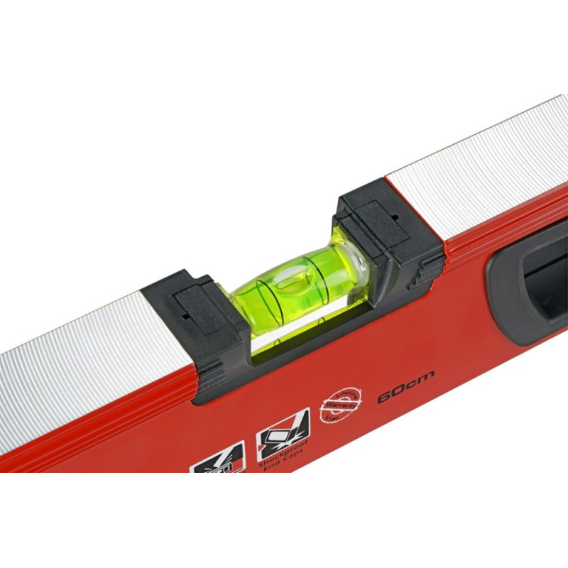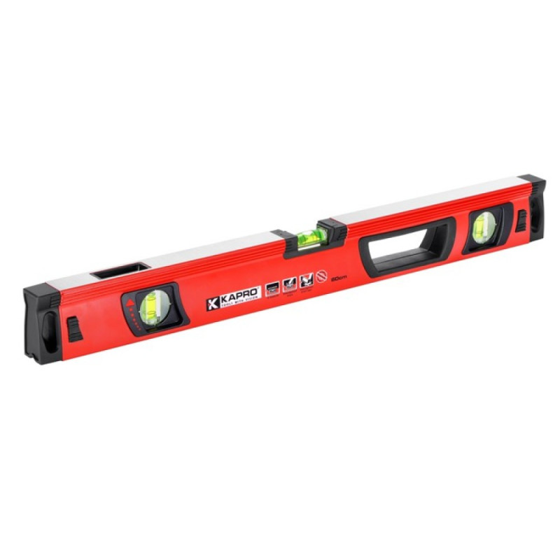 Eyelets: - A spirit level with an easy-to-see eye that is up to 33% larger than before. - PLUMB SITE® DUAL-VIEW™ - top-view eyelets. - All the spirit levels have 2 vertical and 1 horizontal eyelets. - Accuracy: 0.5 mm/m. Shape and design: - V-shaped base which allows the spirit level to be used comfortably in corners and on pipes. - Milled on both sides for an extremely precise surface. - Rubber, sturdy, shock-absorbing tips for excellent shock absorption. - Comfortable rubber-coated handles - from 80 cm long, the spirit levels have 2 handles. The tool is used for: - For carpentry work. - For construction work. - For masonry work. - For roofing work.