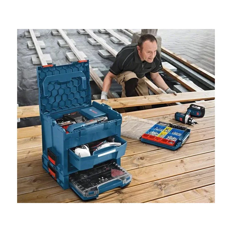 Konstrukcija: • MASTERPRO serijos dėžė. • Dvipakopė. • Viršutinė dėžės pakopa turi pagalbines kojeles, neleidžiančias dėžei apvirsti. • Metaliniai fiksatoriai. • Išmatavimai: 18 - 46 x 24 x 14 cm. ; 22 - 57 x 31 x 17 cm. Privalumai: • Tvirta. • Talpi. • Patogi sistema ledžianti talpinti daug įvairių įrankių. • Galima formuoti skyrelius pagal savo poreikius.