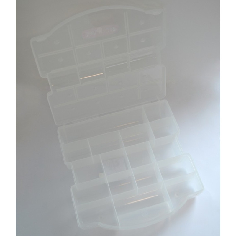• Tvirto plastiko. • Tinka laikyti įvairias smulkmenas tiek meistrams tiek buityje. • 17 skyrių. • Dėžės išmatavimai: plotis 26 cm, gylis 26 cm, aukštis 7 cm. • 9 skyrių dėtuvės išmatavimai: plotis 23 cm, gylis 19 cm, aukštis 7 cm.