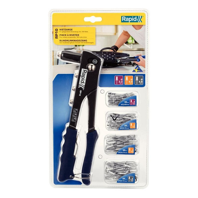 Prekės ženklas- Rapid. Modelis- RP10. Artikulas- 5000376. Ilgis- 350 mm. Tinkamų kniedžių dydžiai- 3,2 mm, 4 mm, 4,8 mm. Tinkamos kniedės- Aliuminės. Svoris- 0.56 kg. Garantija- 24 mėn. Papildoma informacija- Priedas: 100 vnt kniedžių .