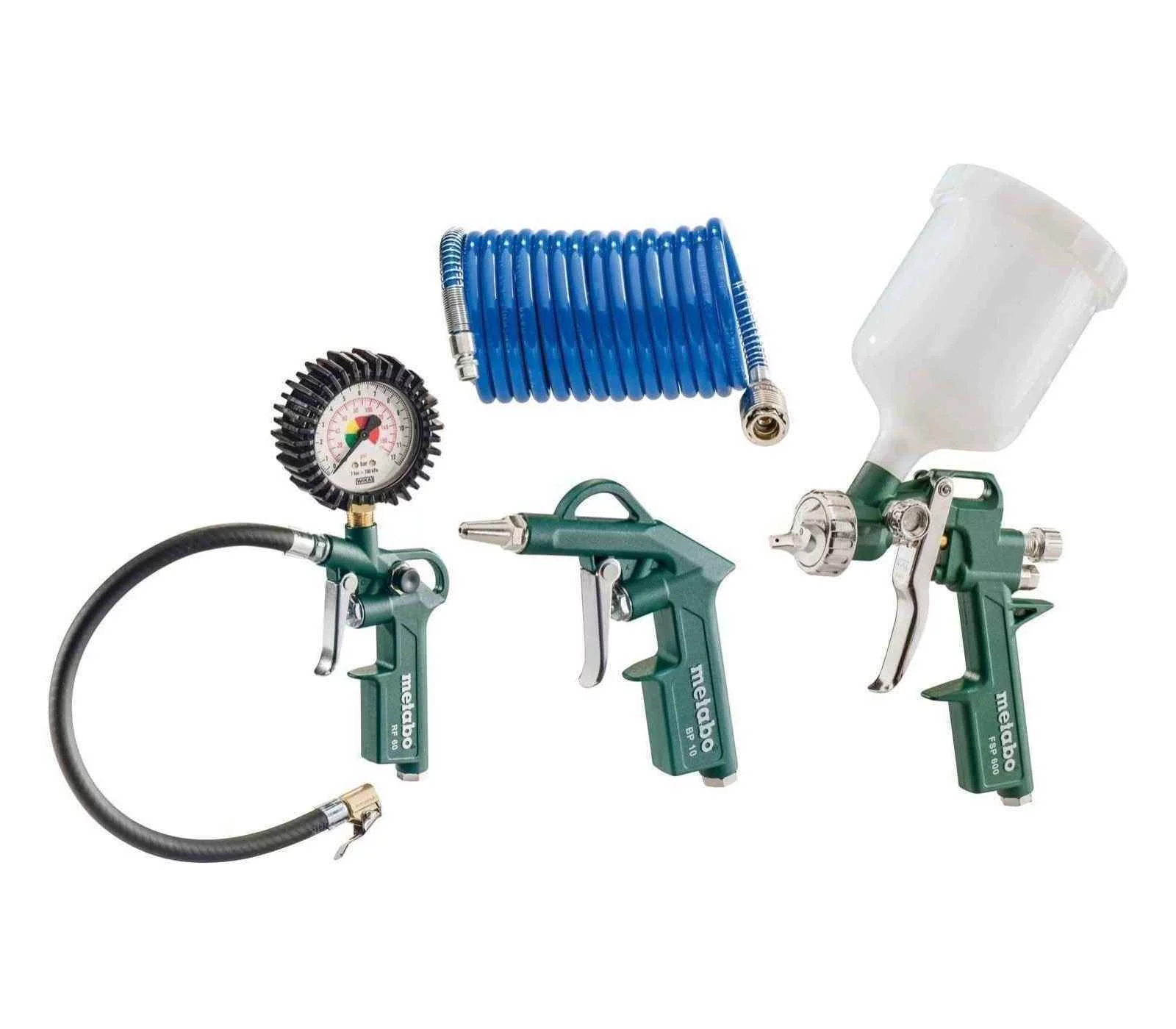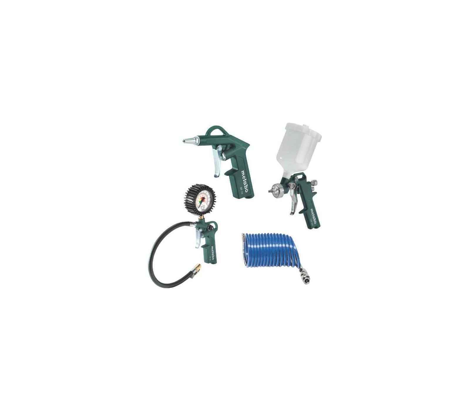 Nupūtimo pistoletas, padangų pūtimo pistoletas su manometru, dažų purkštuvas su konteineriu ir PA spiralinė žarna.
