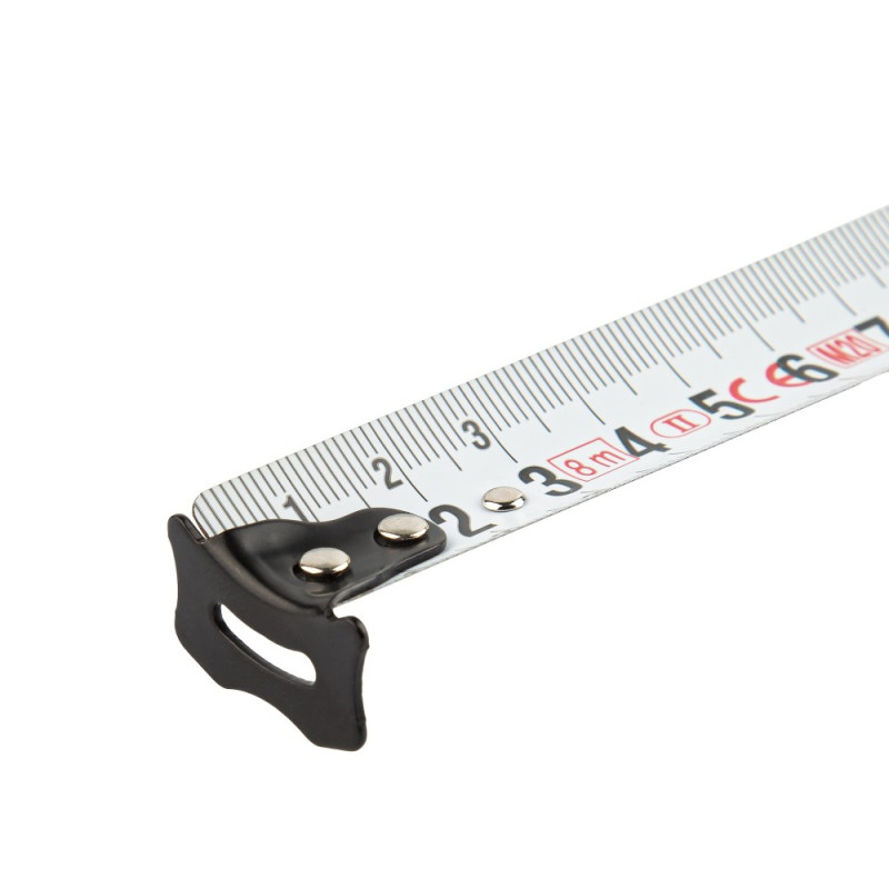 Juosta ir kabliukas: • Nailono danga – didesnis atsparumas trinčiai. • 3 kniedžių kabliukas užtikrina ilgaamžiškumą. Forma ir konstrukcija: • Kokybiškas sukimo mechanizmas užtikrina ilgaamžiškumą. • Tvirtas ABS plastikinis korpusas. • 2 klasės tikslumas: ± 2,3 mm paklaida per 10 m. • CE sertifikatas ir patikros sertifikatas užtikrina, kad ruletė itin patikima ir tiksli. Įrankis naudojamas: • Abrazyvinių medžiagų matavimo darbams.