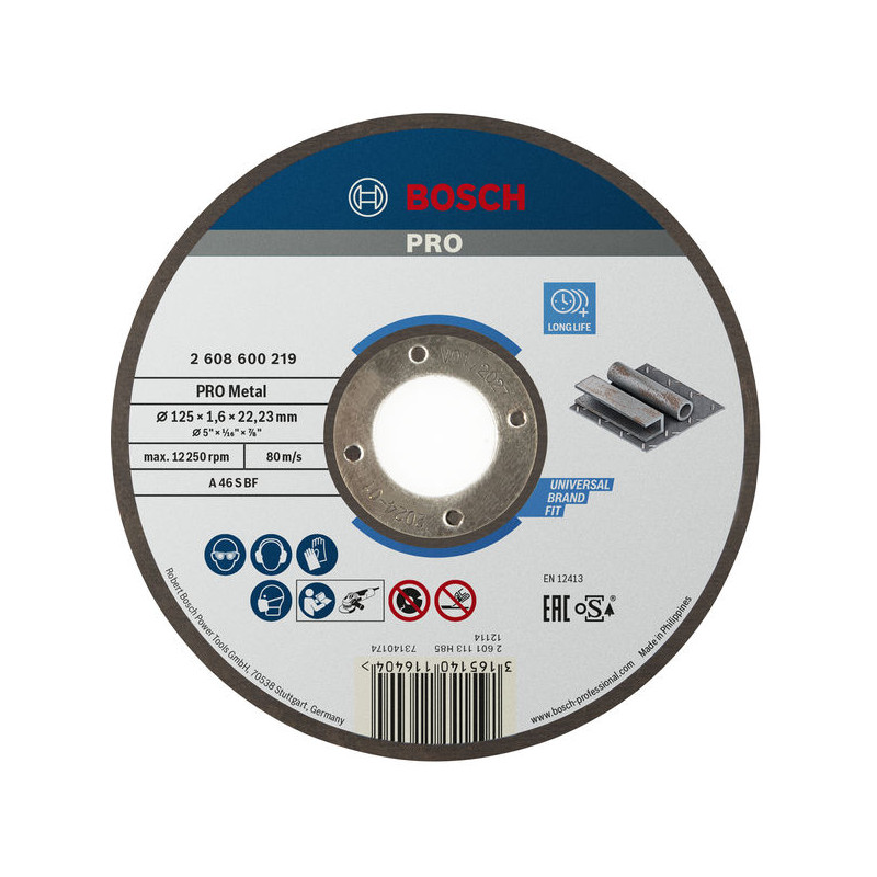 Prekės ženklas- Bosch. Storis- 1.6 mm. Skersmuo- 125 mm. Vidinės skylės skersmuo- 22.23 mm. Svoris- 0.042 kg. Maksimalus sūkių dažnis per minutę- 12250 rpm. Pjovimo greitis- 80 m/s. Disko forma- Tiesus. Apdirbama medžiaga- Metalas. Vienetai pakuotėje- 1. Papildoma informacija- Svoris: 0,042 kg. Maksimalus greitis per minutę: 12250 aps./min. Pjovimo greitis: 80 m/s.