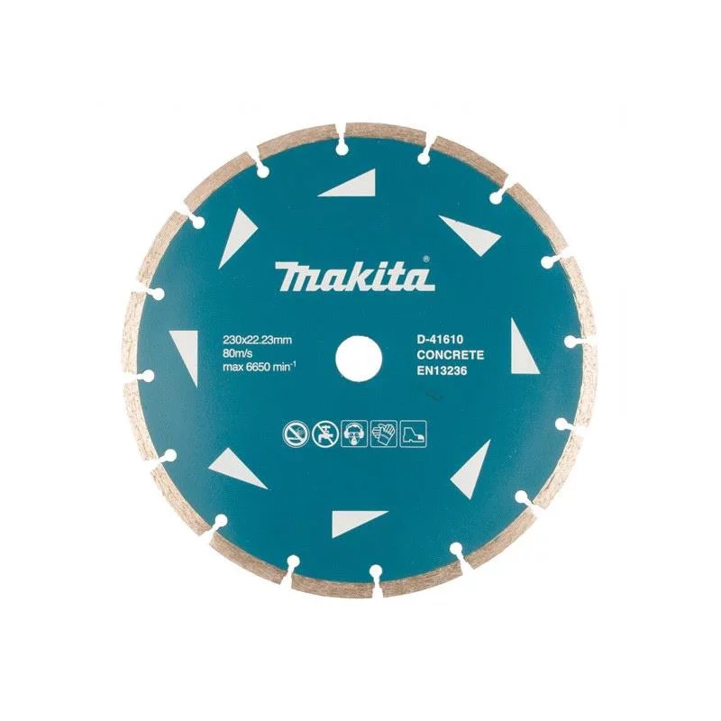 Prekės ženklas- Makita. Artikulas- D-41610. Skersmuo- 230 mm. Vidinės skylės skersmuo- 22.23 mm. Storis- 2.6 mm. Svoris- 0.7 kg. Deimantinio disko tipas- Segmentinis. Apdirbama medžiaga- Betonas, Gipskartonis. Tinka pjovimui- Sausam. Vienetai pakuotėje- 1. Segmento aukštis- 7 mm. Maksimalus sūkių dažnis per minutę- 6650 rpm. Pjovimo greitis- 80 m/s. Tinka įrankiams- Kampiniams šlifuokliams.