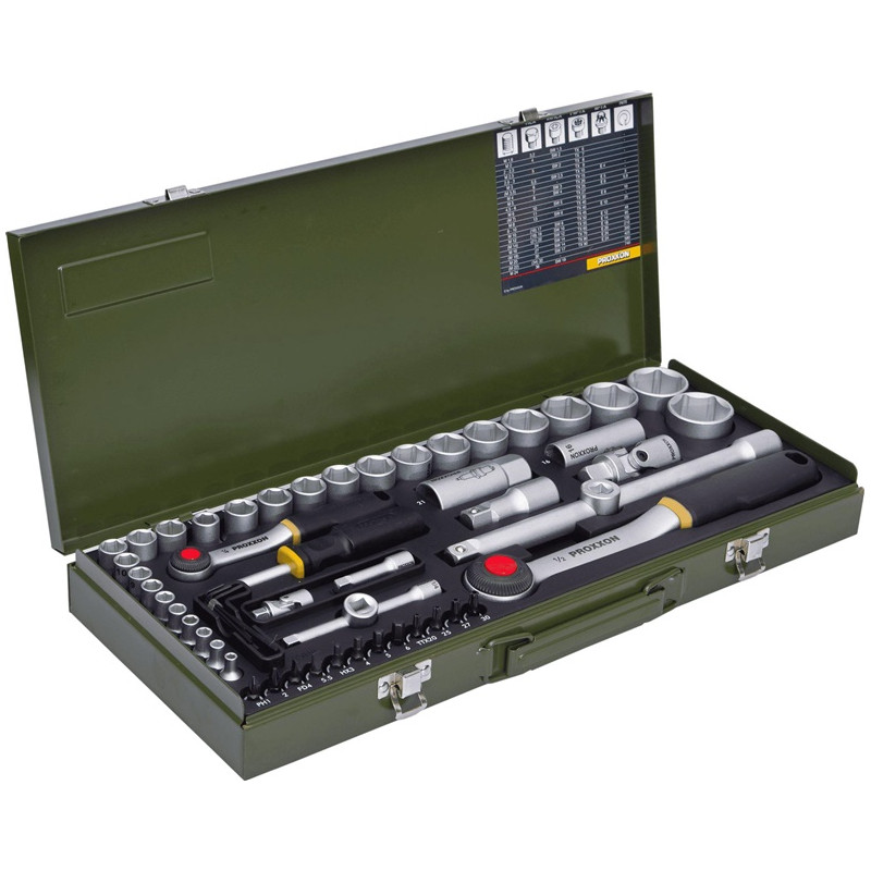 Prekės ženklas- Proxxon. Artikulas- 23040. Medžiaga- Metalų lydinys, Plastikas. Colinė jungtis- 1/2", 1/4". Veržlės / varžto dydis- 4 - 32mm. Lankstus- Ne. Garantija- 24 mėn. Komplekto dalių skaičius- 55. Komplekte- ¼+½ galvutės: 26vnt: 4-32mm. 2 terkšlės. 2 žvakių galvutės: 16mm, 21mm. 2 lanksčios jungės. 2 adapteriai. 2 ilgintuvai. 12 atsuktuvų antgalių: ph1,2, fd4,5,5,hx3,4,5,6,tx20,25,27,30. 1 atsuktuvo rankena. 7vnt šešiakampių atsuktuvų: 1.25-3mm.