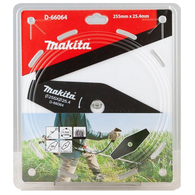 Žoliapjovės priedų tipas- Pjovimo peilis. Prekės ženklas- Makita. Artikulas- D-66064. Ilgis- 25.5 cm. Plotis- 25.5 cm. Skersmuo- 255 mm. Medžiaga- Metalų lydinys.