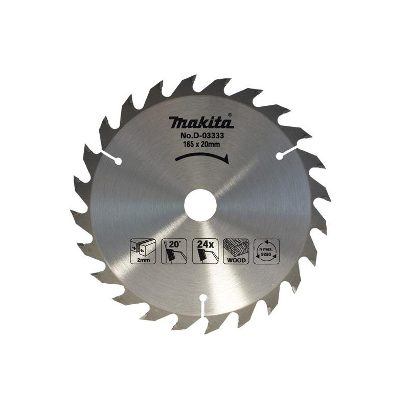 Prekės ženklas- Makita. Artikulas- D-03333 . Skersmuo- 165 mm. Vidinės skylės skersmuo- 20 mm. Storis- 2 mm. Medžiaga- Metalas. Dantukų skaičius- 24. Dantukų kampas- 20 °. Maksimalus sūkių dažnis per minutę- 9250 rpm. Pjūvio storis- 2 - 2mm. Tinkamas pjovimas- Sausas. Su žiedu- Ne. Vienetai pakuotėje- 1. Garantija- 24 mėn. Papildoma informacija- Tinka modeliams: BSS611, BS610, BHS630 ir 5604. Apdirbama medžiaga- Mediena.