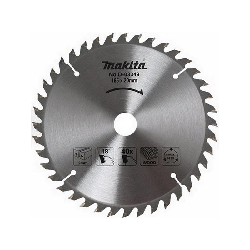 Prekės ženklas- Makita. Artikulas- D-03349. Skersmuo- 165 mm. Vidinės skylės skersmuo- 20 mm. Storis- 2 mm. Svoris- 0.257 kg. Medžiaga- Metalas. Dantukų skaičius- 40. Dantukų kampas- 18 °. Maksimalus sūkių dažnis per minutę- 9250 rpm. Pjūvio storis- 2 - 2mm. Tinkamas pjovimas- Sausas. Su žiedu- Ne. Vienetai pakuotėje- 1. Garantija- 24 mėn. Papildoma informacija- Dantų kampas: 18°. Maksimalus greitis per minutę: 9250 aps./min. Svoris: 0,257 kg. Tinka modeliams: 5603R 5604R. Apdirbama medžiaga- Mediena.