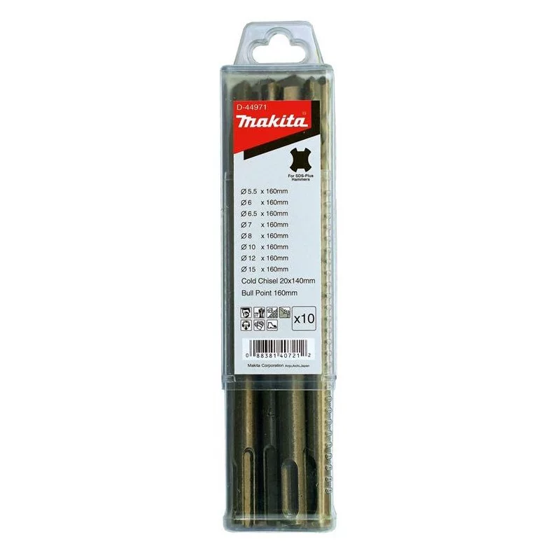 Prekės ženklas- Makita. Modelis- D-44971. Ilgis- 16 cm. Plotis- 2 cm. Apdirbama medžiaga- Betonas, Akmuo. Artikulas- -. Medžiaga- Metalas. Svoris- 0.7 kg. Komplekto dalių skaičius- 10. Papildoma informacija- SDS+ grąžtai: 5.5, 6, 6.5, 7, 8, 10, 12, 15 x 160mm; kaltai: plokščias 20x160mm, smailus 160mm. Su rankena- Ne.