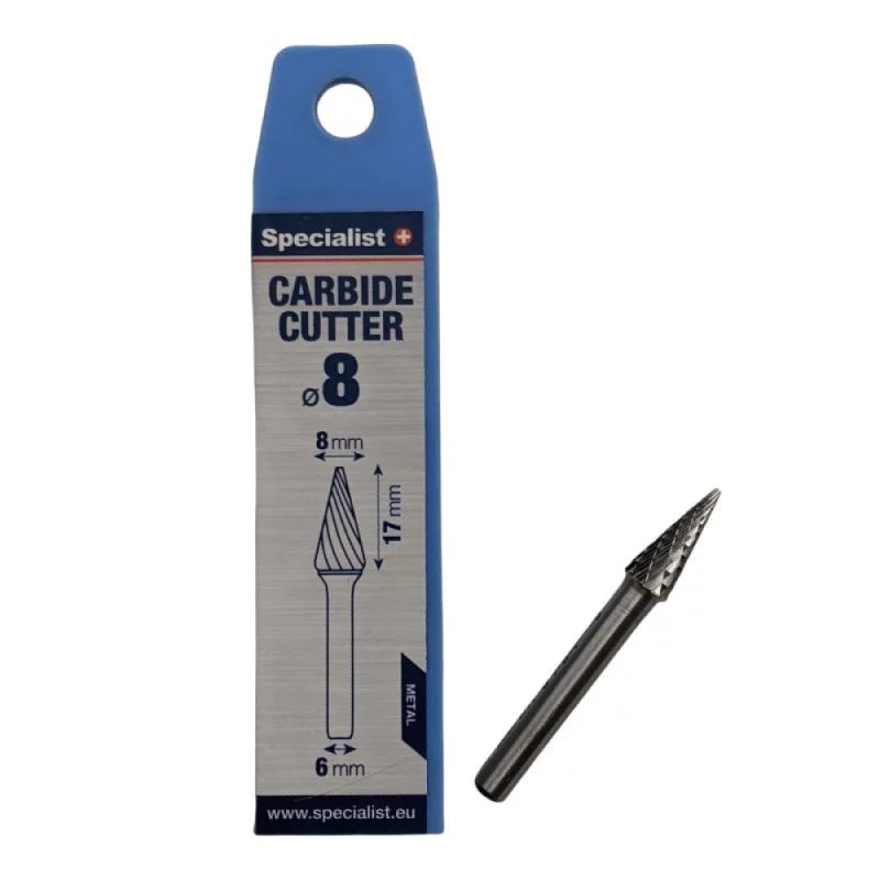 Karbido freza patogesniam ir lengvesniam metalo paviršiaus apdirbimui. Savybės ir ypatumai: • Puikiai tinka plokštumai lyginti. • Suvirinimo siulėms šlifuoti, skylėms platinti ir kt. • Galima dirbti tiek su pneumatiniu tiesiniu šlifuokliu, tiek su elektriniais bei akumuliatoriniais suktuvais / grežtuvais • Kotelio skersmuo: 6 mm. • Forma: M (smailas kūgis) • Frezos skersmuo: 8 mm. • Frezos darbinis ilgis: 17 mm.
