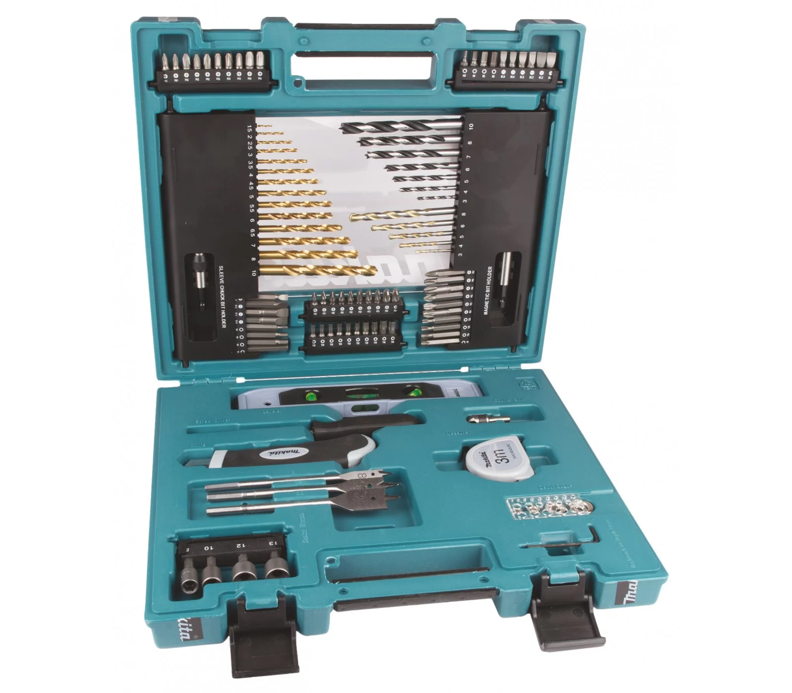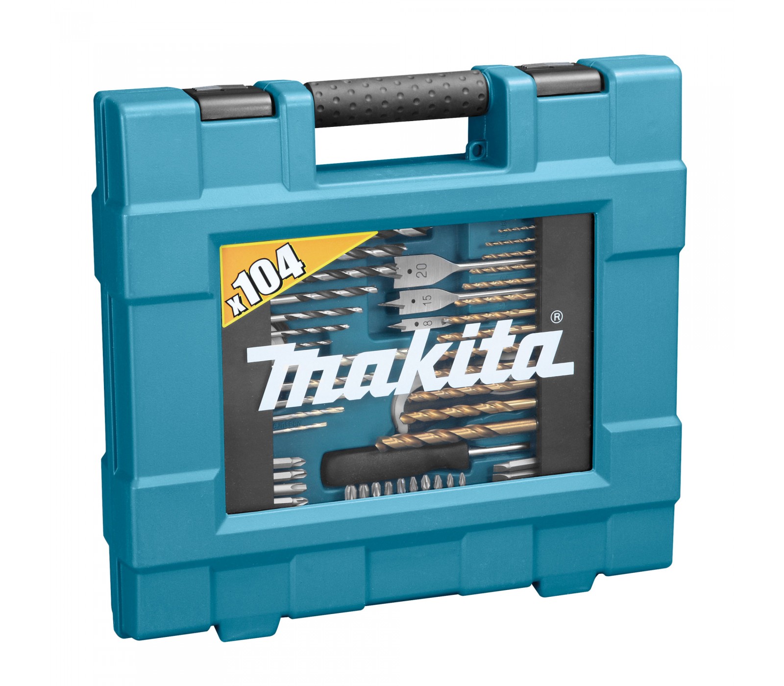 Grąžtų ir sukimo antgalių rinkinys Makita D-31778, 104 vnt. – universalus rinkinys darbams su metalais, mediena ir mūru. Pakuotėje yra 14 HSS-TiN grąžtų metalui, 10 grąžtų medienai, 6 mūro grąžtai, 1 įgilinimo antgalis, 5 gręžimo ribotuvai, 58 sukimo antgaliai, 2 laikikliai ir 4 varžtų sukimo galvos. Visas rinkinys supakuotas į plastikini dėklą, kuris užtikrina patogų ir tvarkingą laikymą. Iš viso 104 dalys, skirtos įvairiems gręžimo ir sukimo darbams.