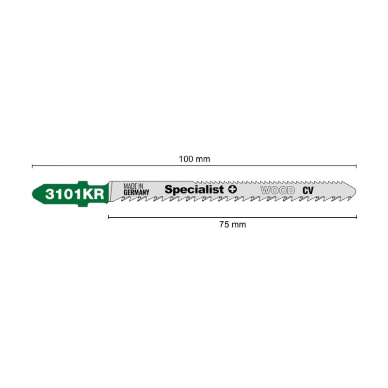 • Dvipusis pjūklelis. • Skirtas 4–30 mm storio medžiagoms pjauti. • Tinka tiesiam ir vingiuotam pjovimui. • CR-V plienas – lankstus, ilgai išlieka aštrus. • Kryžminis dantukų galandimas – efektyvesnis gręžimas ir mažiau stringa. • Pagaminta Vokietijoje. Matmenys: • A = 2,5 mm (10 TPI) • B = 75 mm • C = 100 mm • D = 1,45 mm • E = 8 mm Įrankis naudojamas: • Natūraliai bei apdirbtai medienai pjauti. • Klijuotai medienai pjauti. • Fanerai pjauti. • Laminuotoms medienos plaušo plokštėms pjauti.